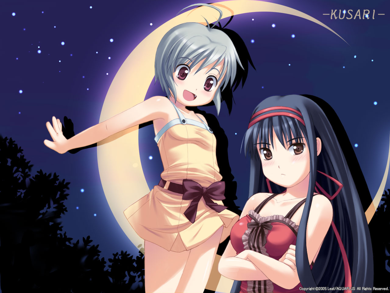 Description: Two anime girls standing next to each other in front of a moon and trees with stars in the sky.