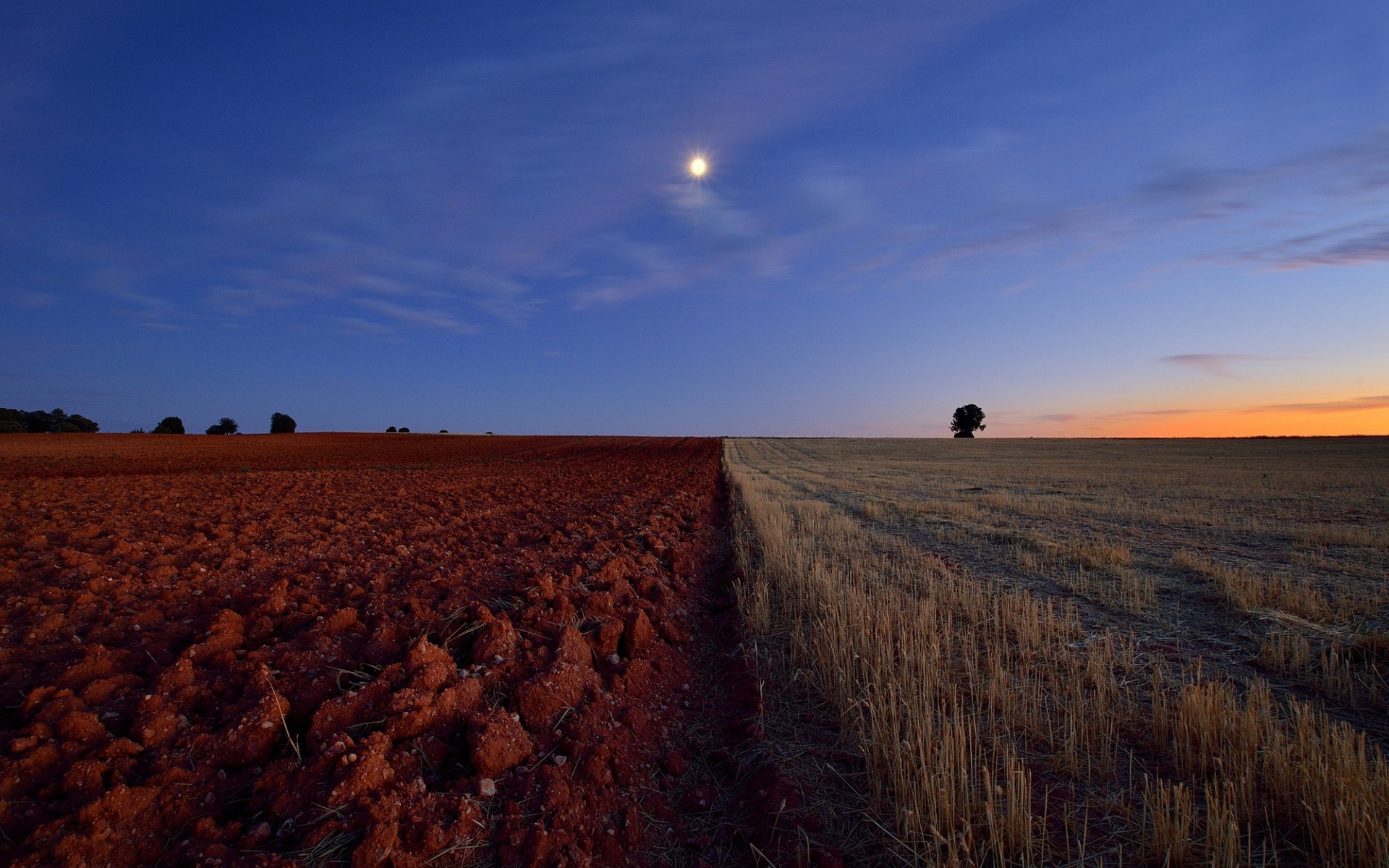 Description: A field with a tree in the distance and a moon in the sky above it and a field with a tree in the distance.