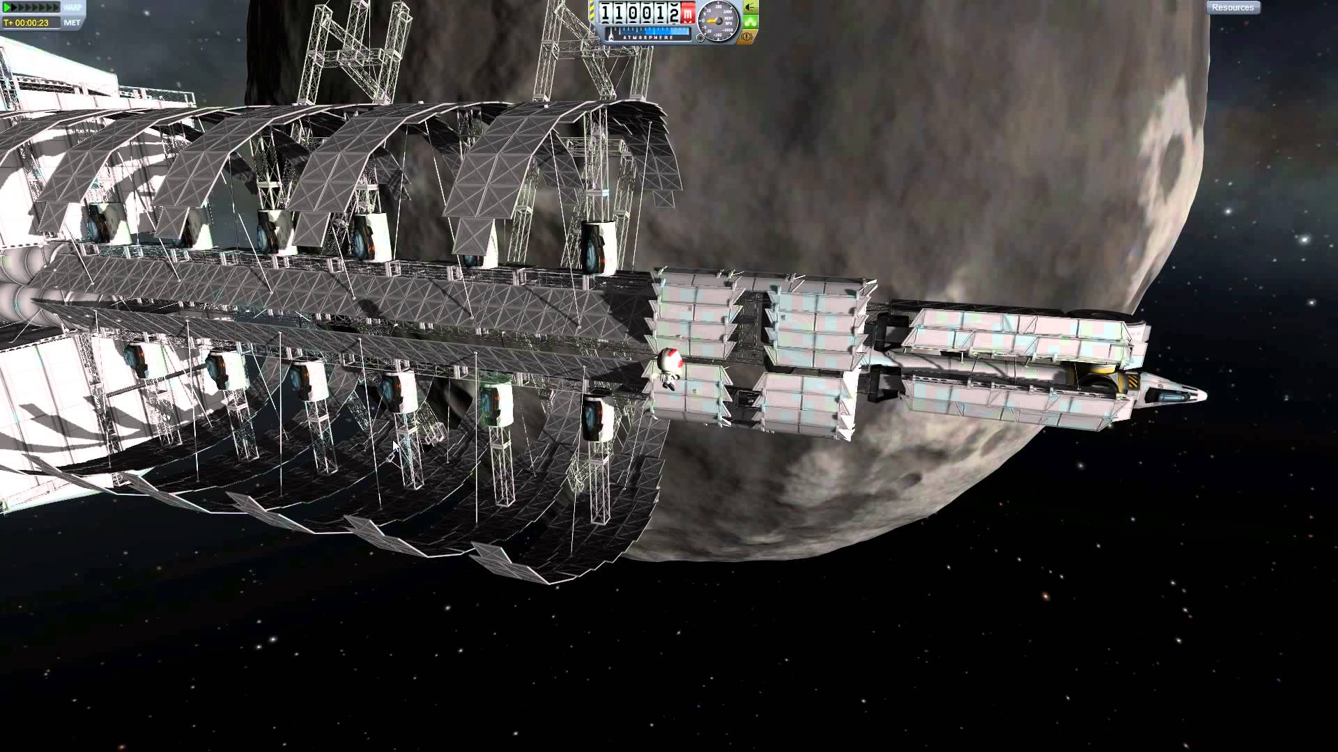 Description: A computer generated image of a space station in the moon with a satellite vehicle nearby and a satellite vehicle in the foreground.