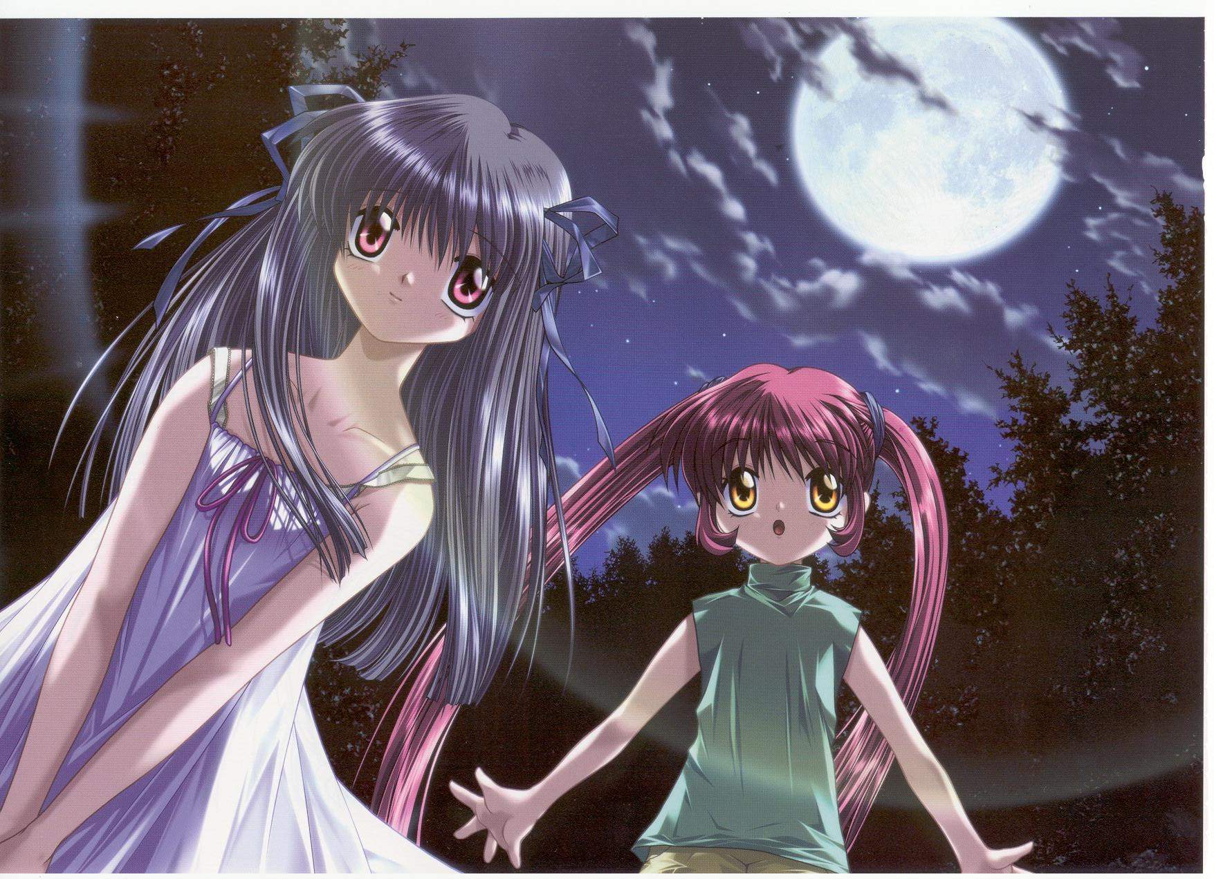 Description: Two anime girls standing in front of a full moon with long hair and big eyes.