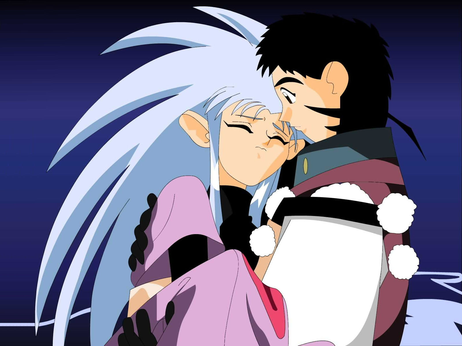 Description: A man and woman kissing in front of a night sky with a moon in the background and a blue sky.