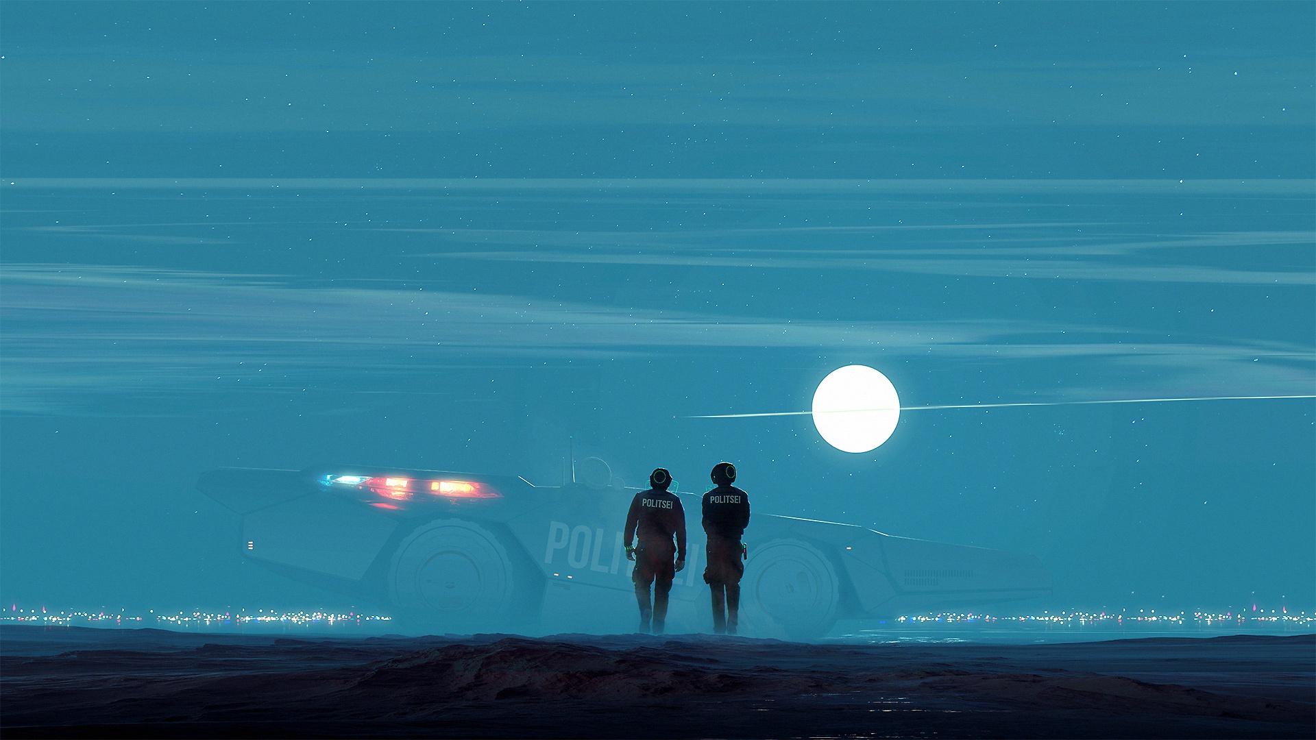 Description: Two people standing in the moonlight looking at a car in the distance with a full moon in the background.