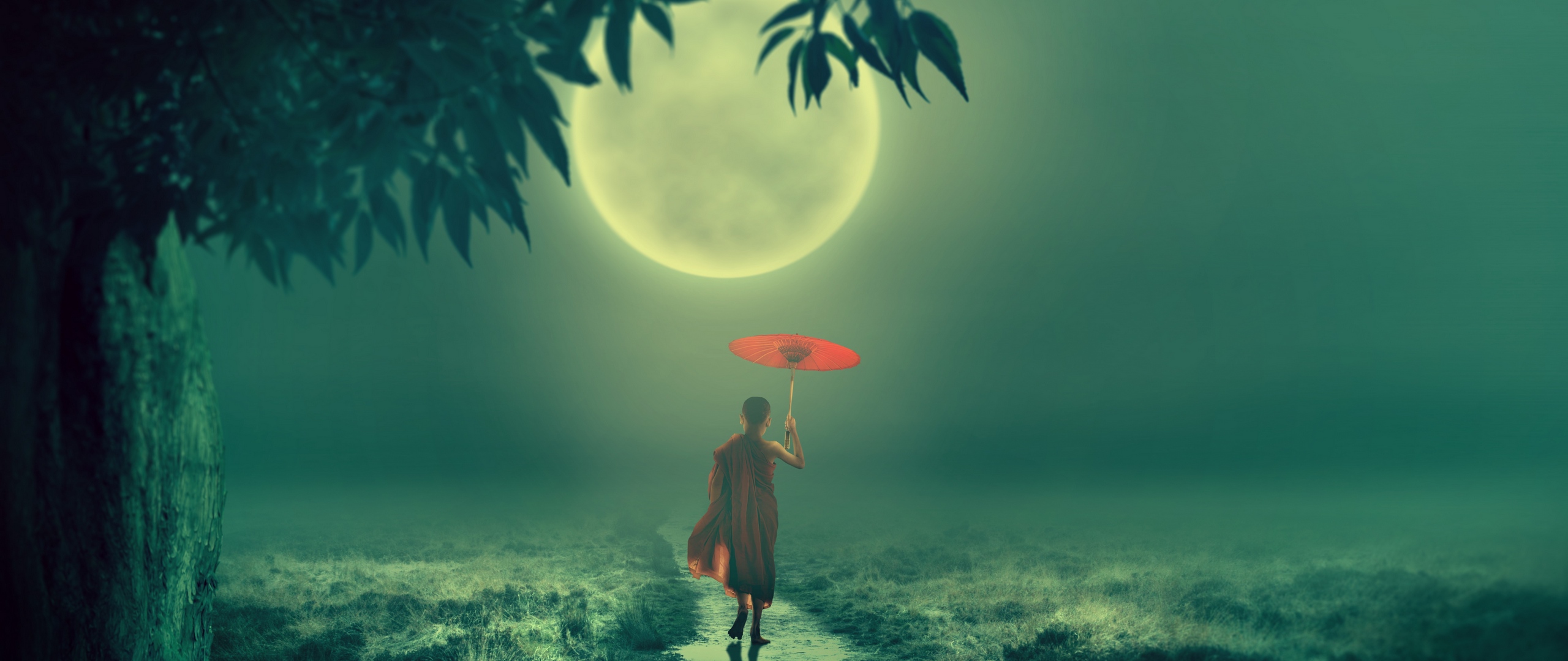 Description: A person holding an umbrella walking in the dark under a full moon with a tree in the foreground.