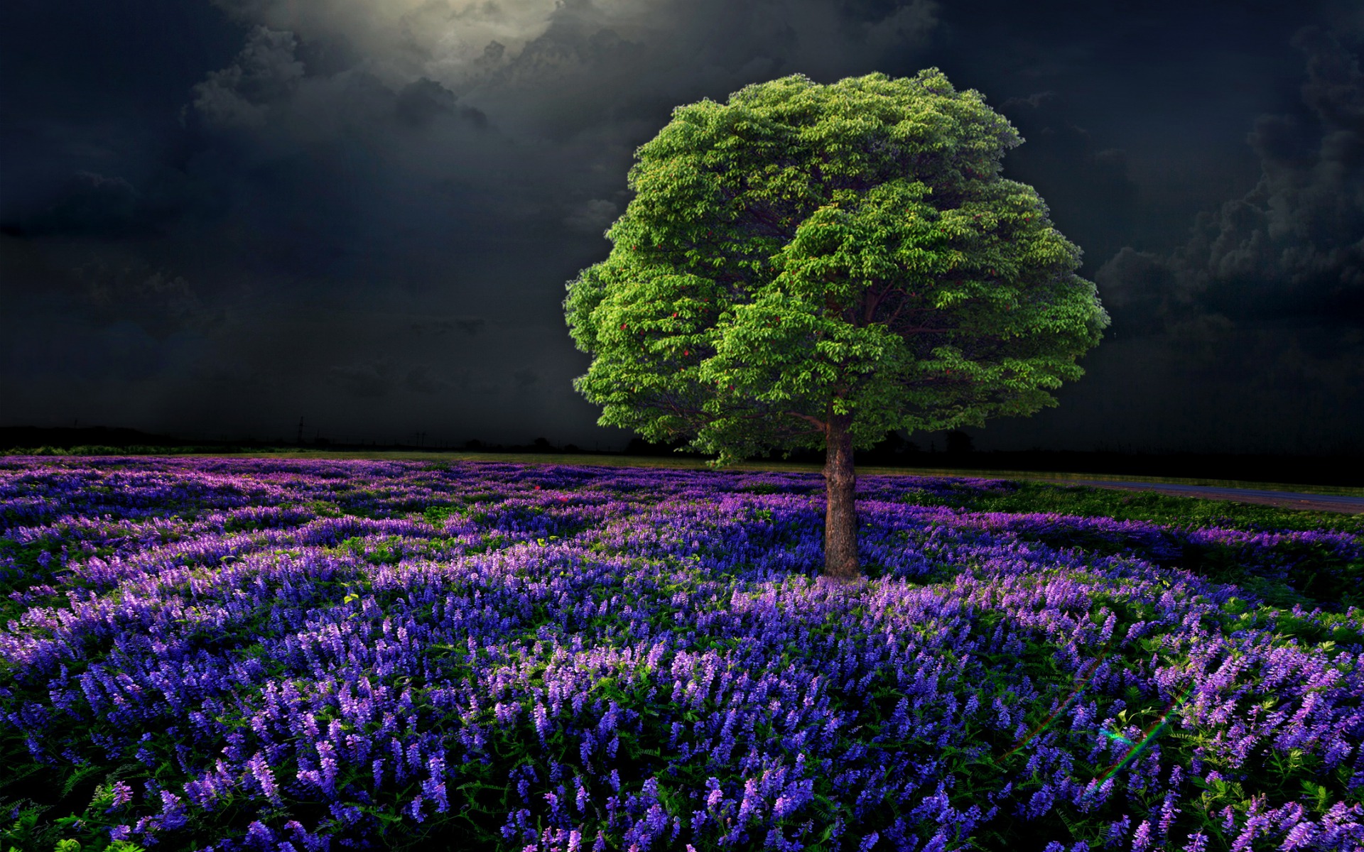 Description: A tree in a field of purple flowers under a full moonlit sky with dark clouds above it and a full moonlit tree in the distance.