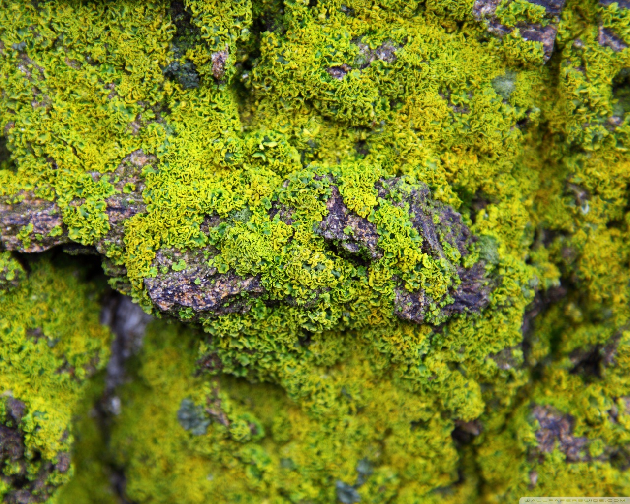 Description: A close up of a mossy surface with small rocks and small rocks in the background and a small bird on the right side of the picture.