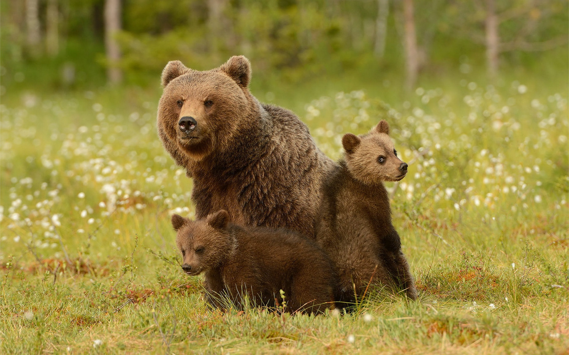 Description: A mother bear and her two cubs in a field of grass and flowers with trees in the background and white flowers in the foreground.