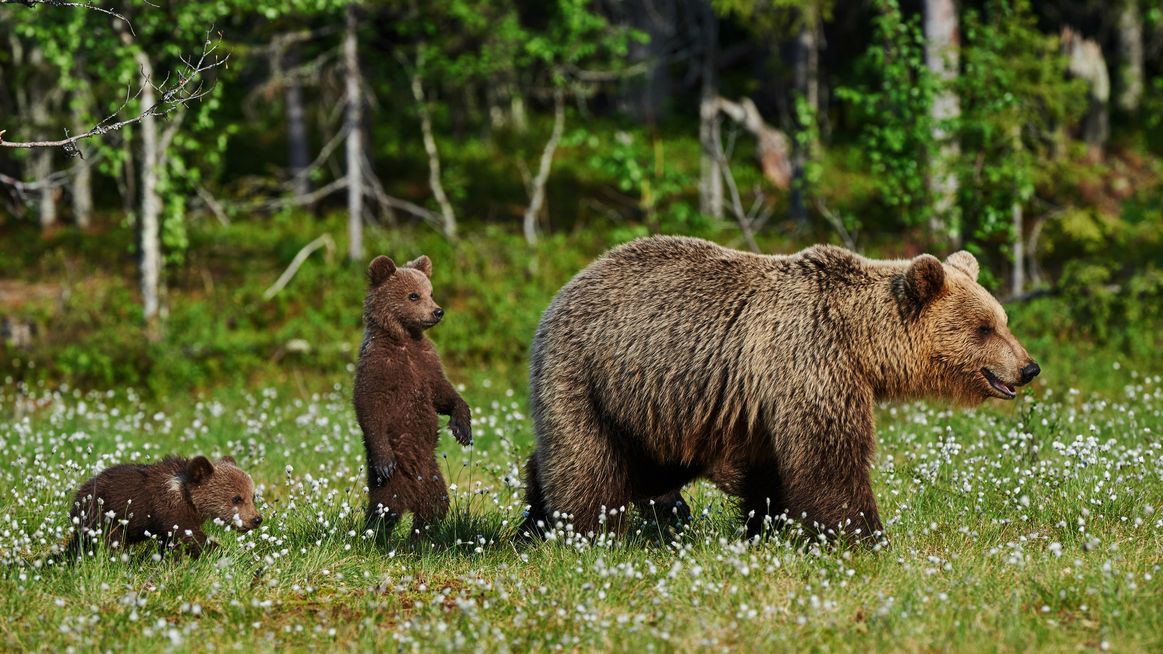 Description: A mother bear and her two cubs in a field of grass and flowers with trees in the background and a few white flowers.