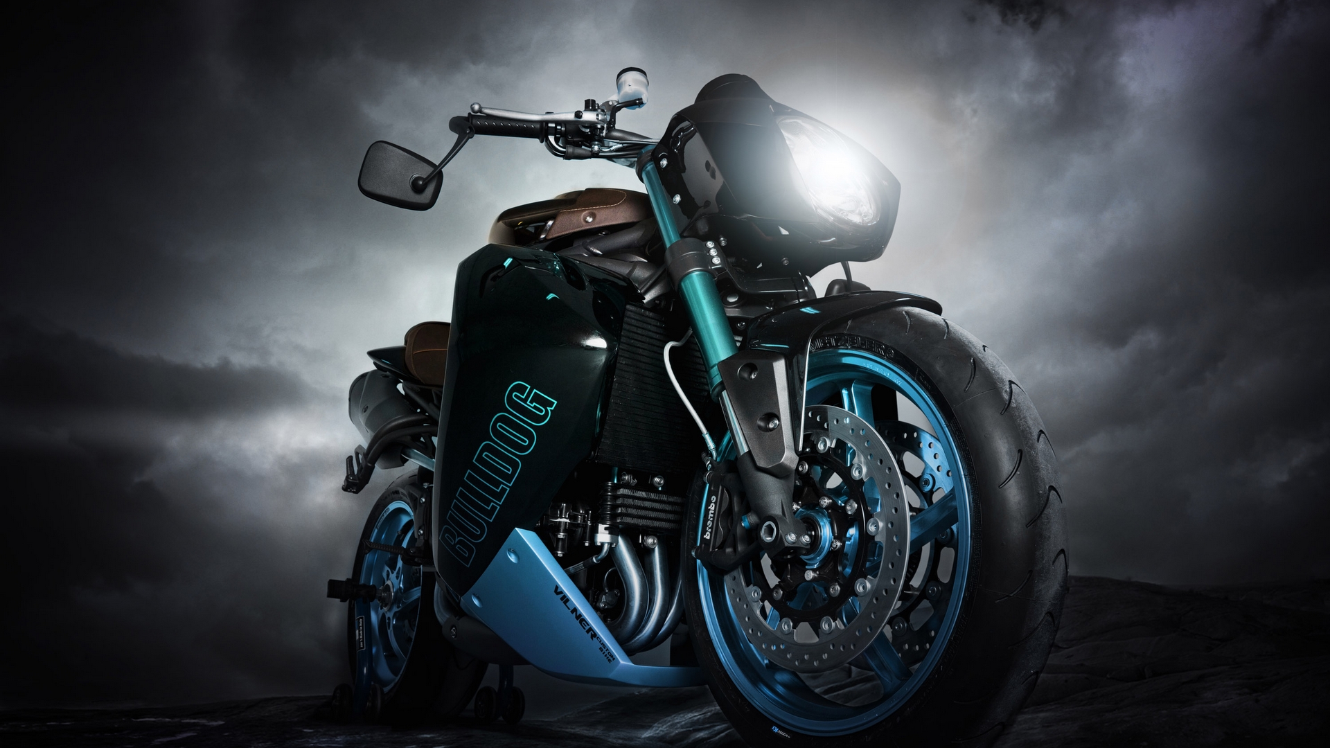 Description: A motorcycle is shown in a dark photo with clouds in the background and a light shining on the bike.