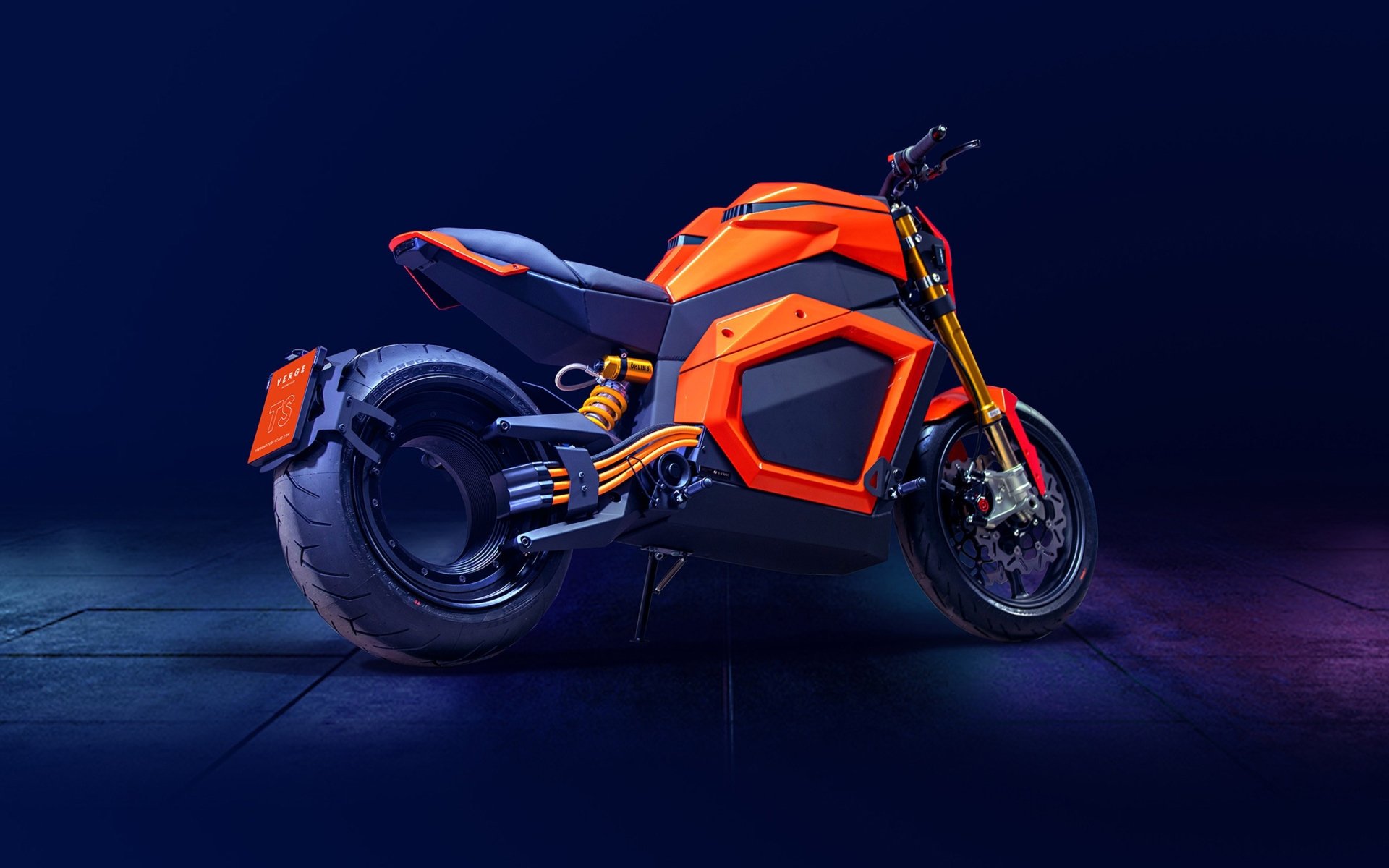 Description: A motorcycle is shown in a dark room with a blue background and a purple light behind it and a black background.