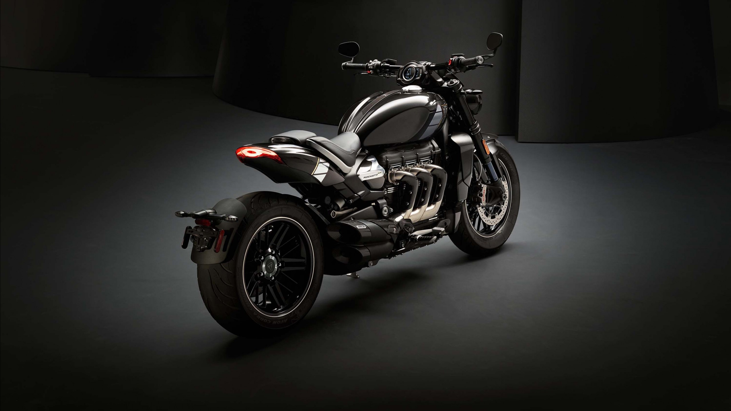 Description: A motorcycle is shown in a dark room with a black background and a black background behind it is a black background.