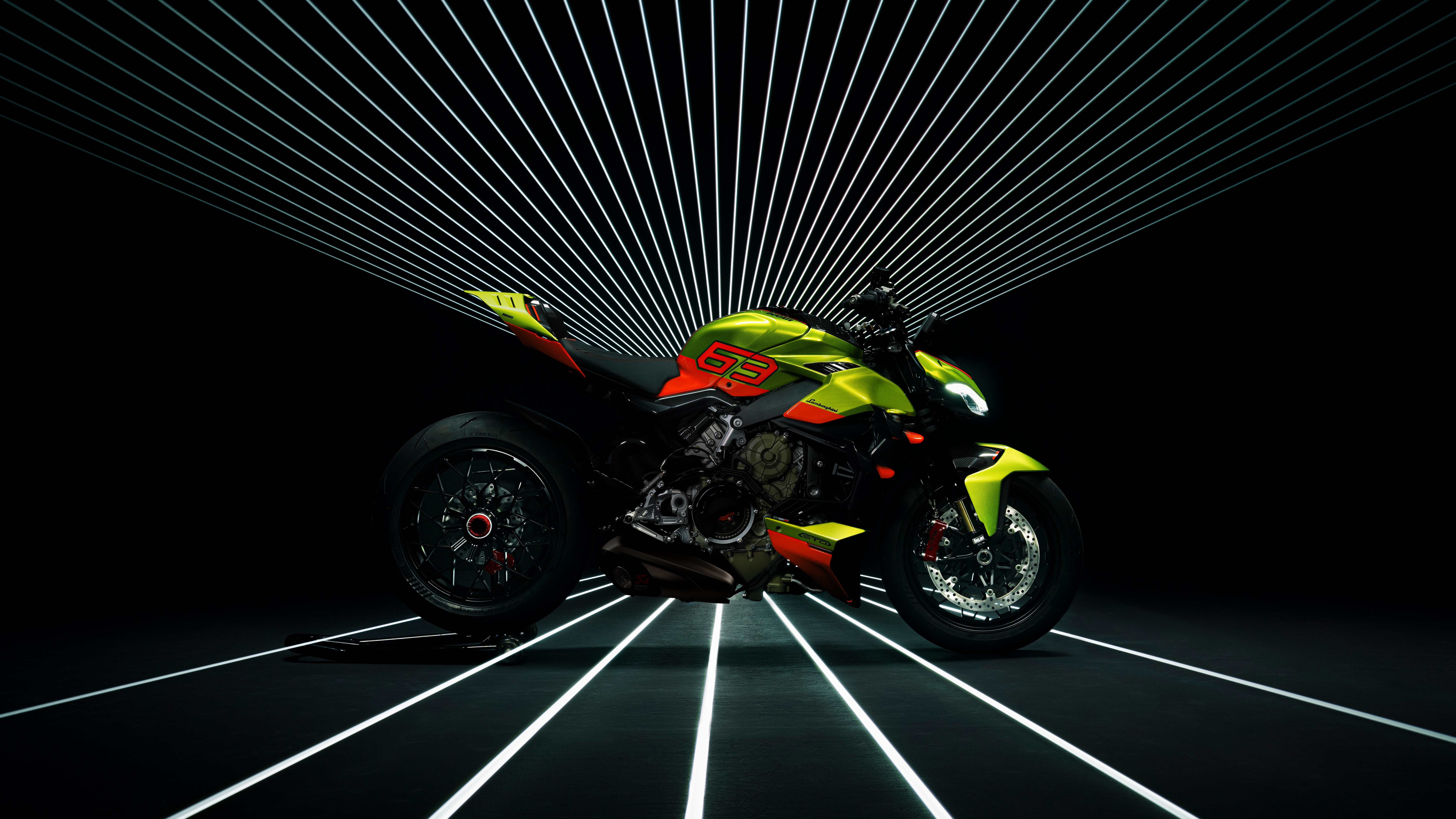 Description: A motorcycle is shown in a dark room with lines on the floor and a black background with white lines.