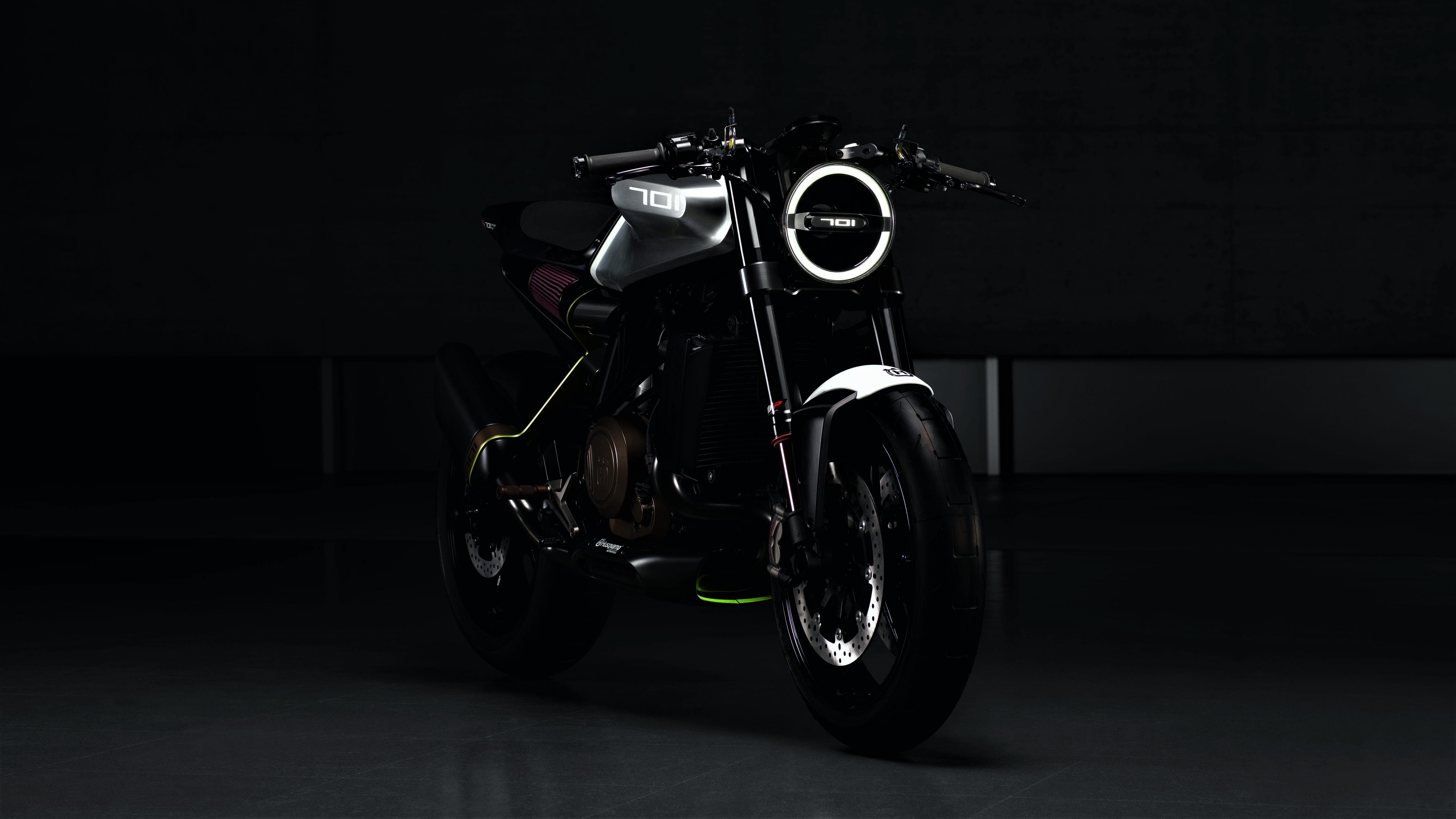 Description: A motorcycle parked in a dark room with a light on it's side wheel and a light on the front of the bike.
