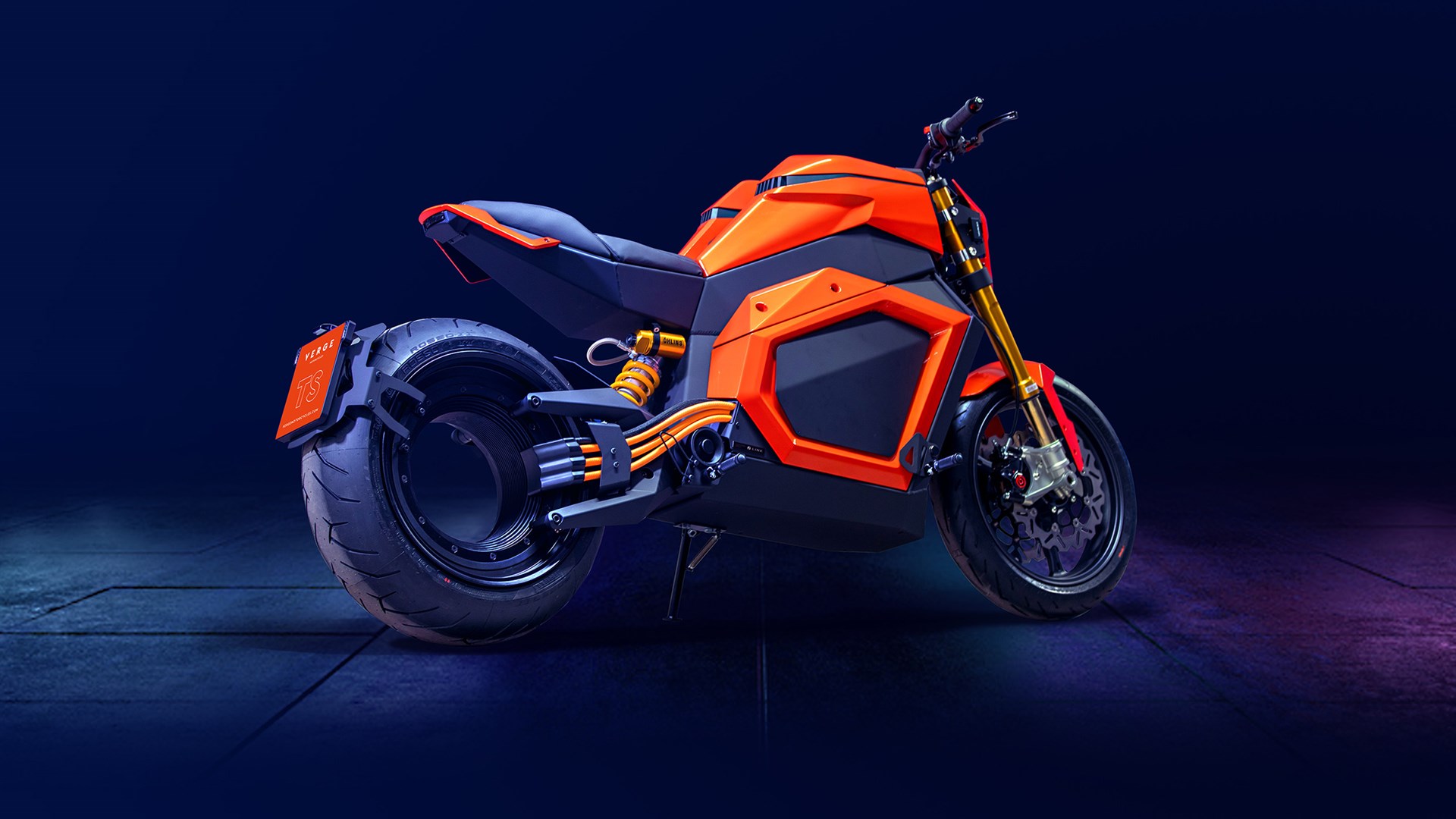 Description: A motorcycle is shown in a dark room with a blue background and a purple light behind it and a black background.
