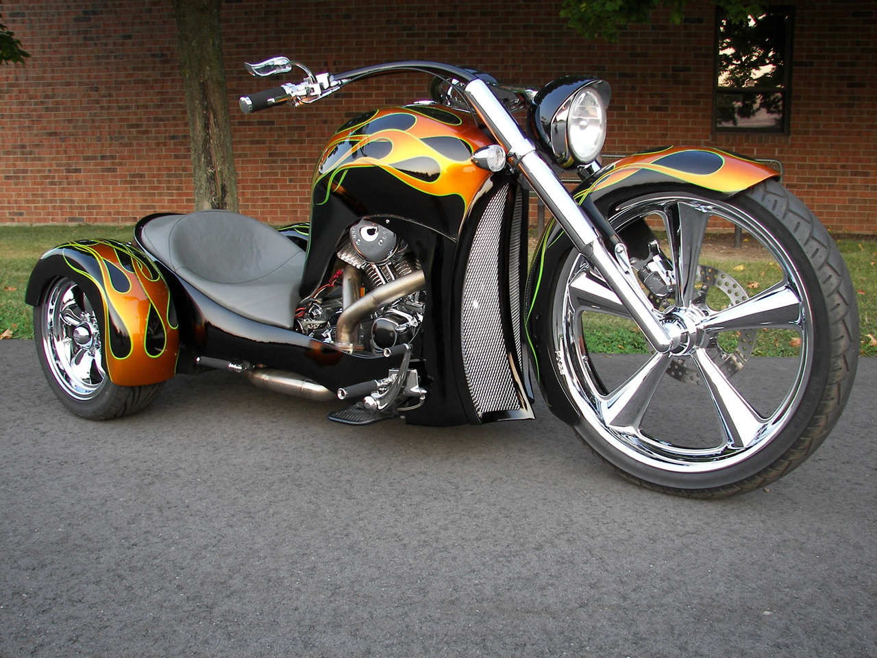 Description: A motorcycle with flames painted on it parked on the street next to a building with a brick wall behind it.