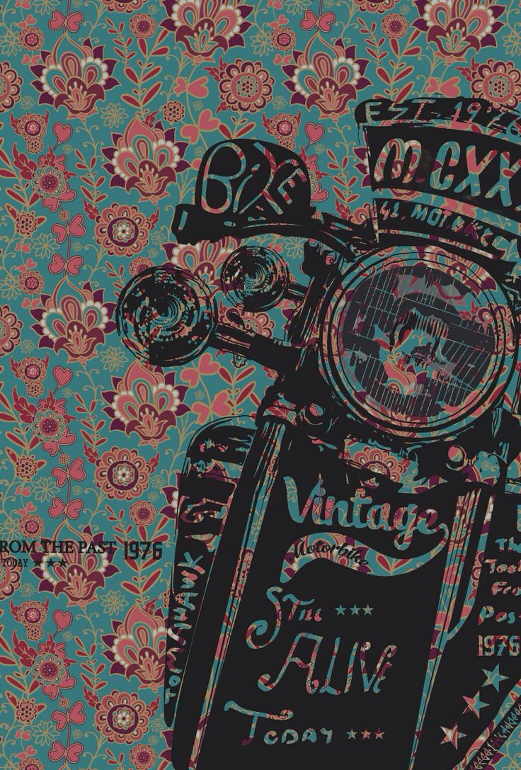 Description: A motorcycle with a floral background and a vintage advertisement on it's side mirror is shown in color.