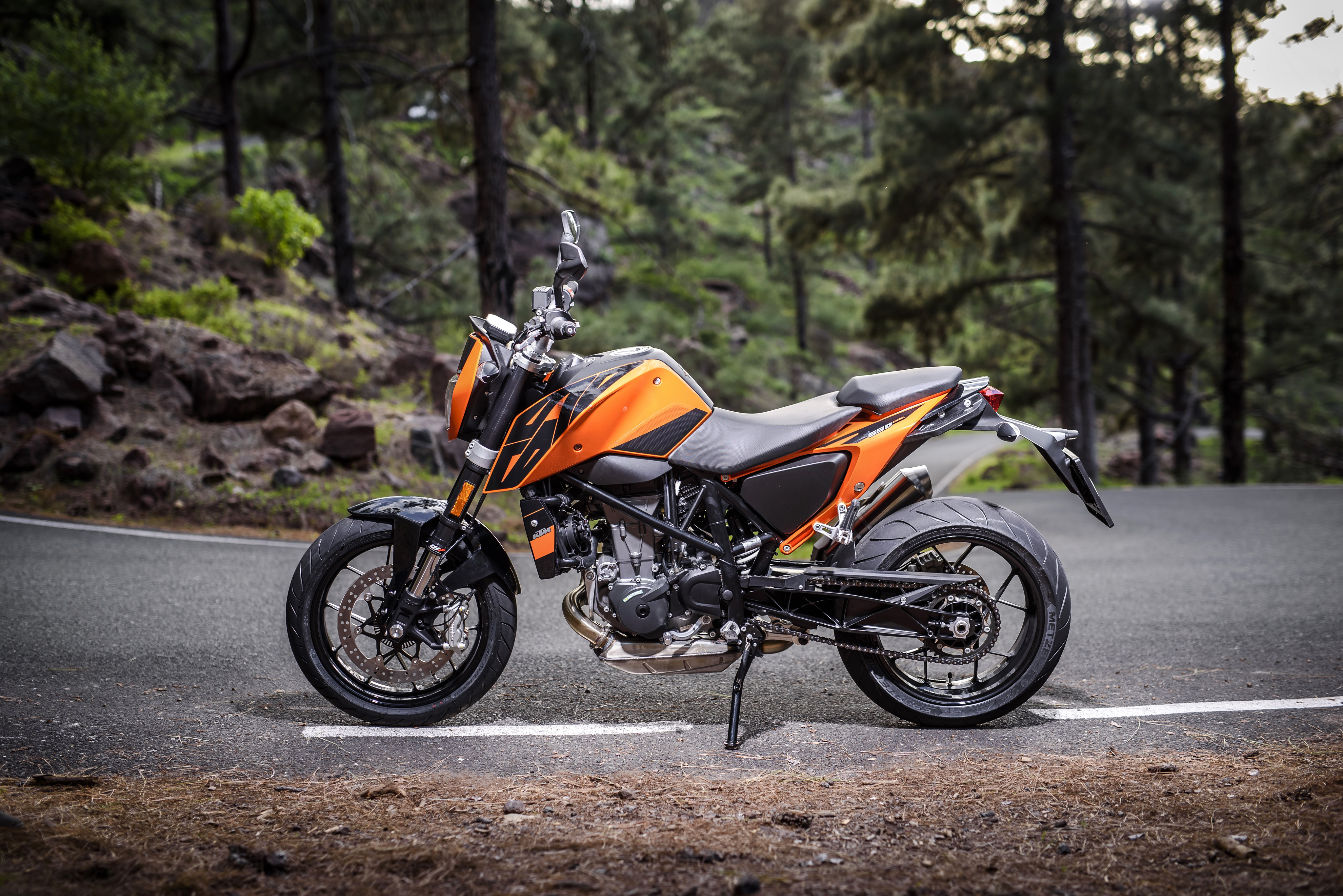 Description: A motorcycle parked on the side of a road near a forest of trees and rocks.
