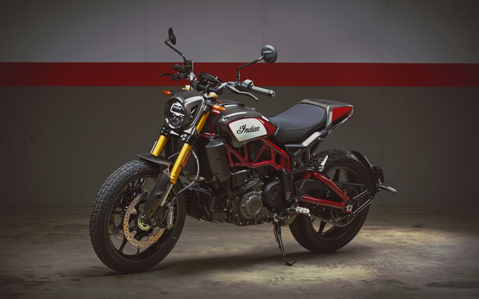 Description: A motorcycle parked in a garage with a red and black seat on it's back end and a red and white seat on the front.