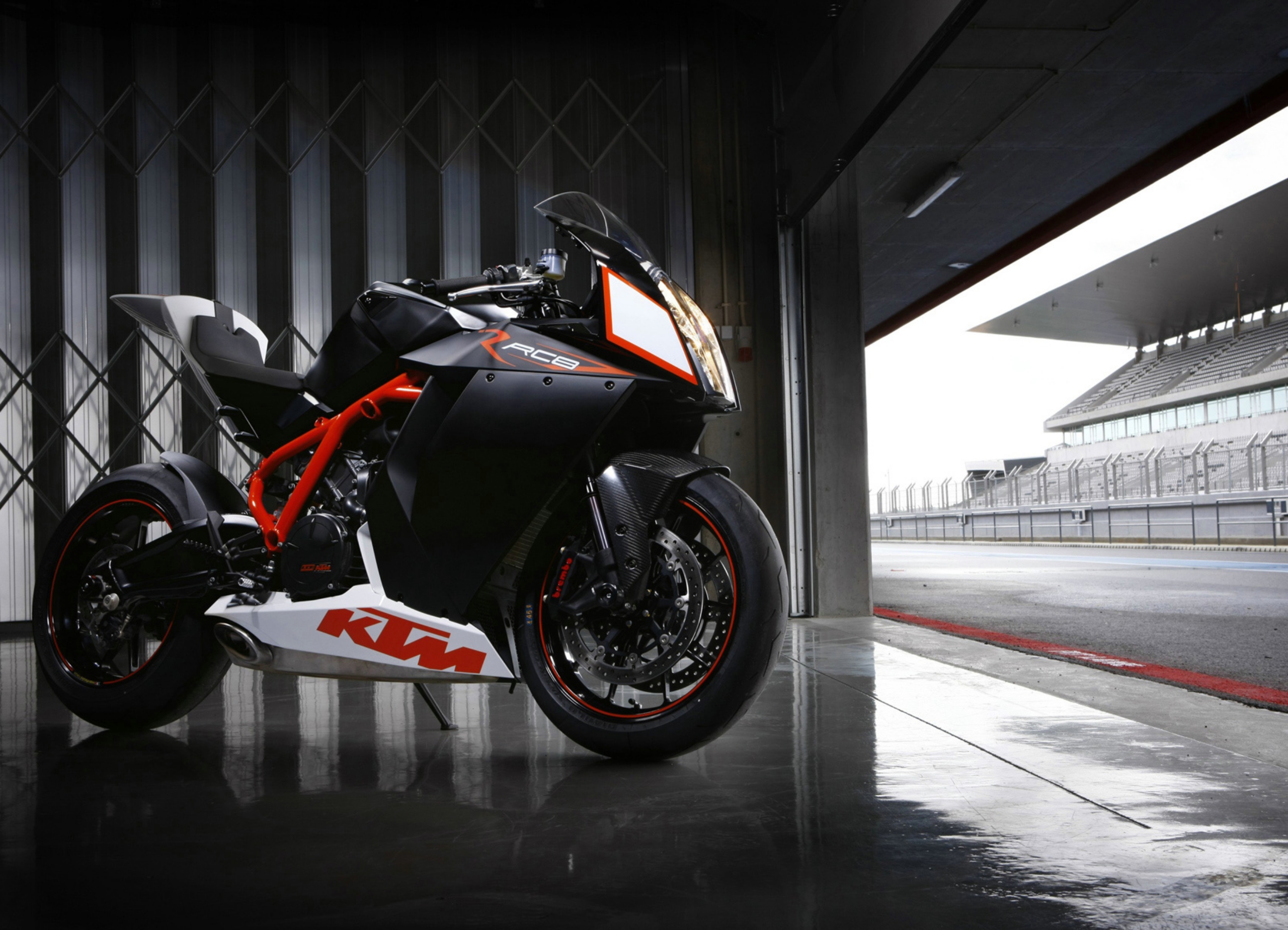 Description: A motorcycle parked in a garage next to a wall with a red stripe on it's side and a black and white stripe on the side.