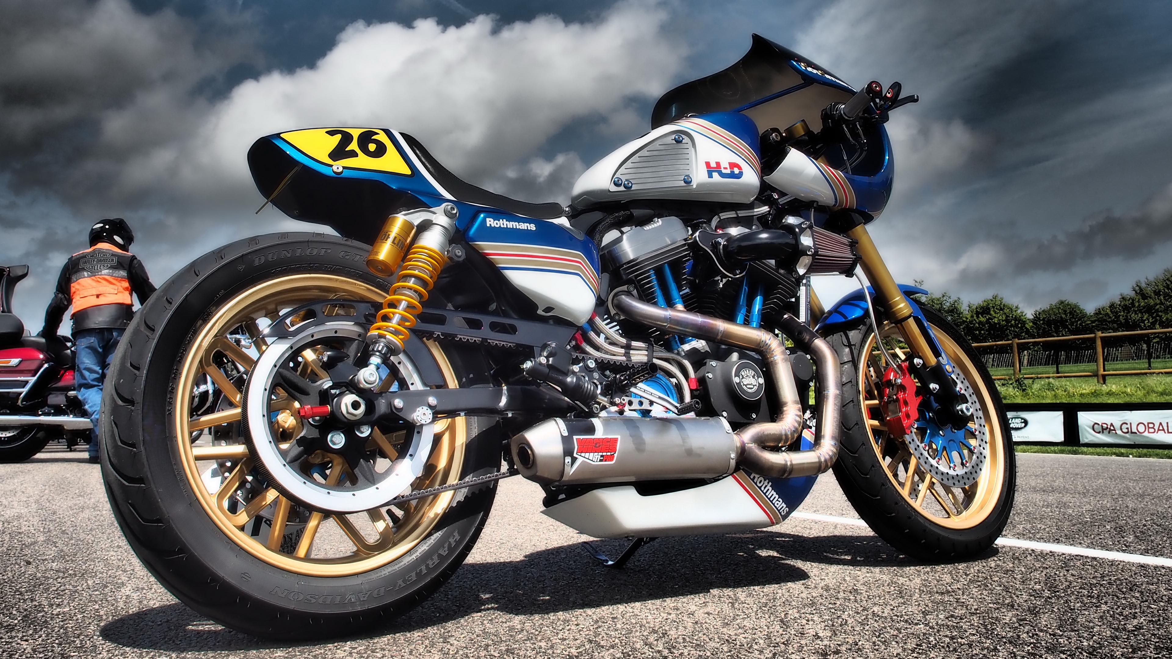 Description: A motorcycle parked on the side of a road under a cloudy sky with a person standing next to it.