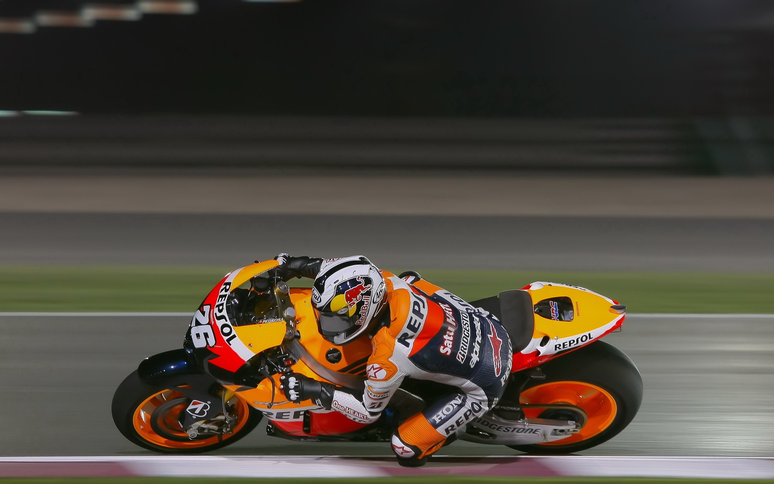 Description: A person on a motorcycle on a track with a helmet on and a helmet on and a helmet on.