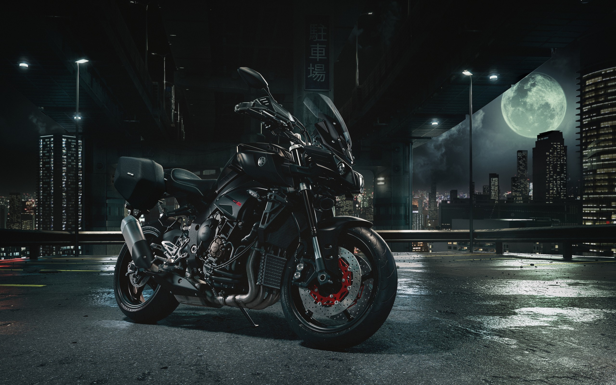 Description: A motorcycle parked in a parking lot at night with a full moon in the background and a city skyline.