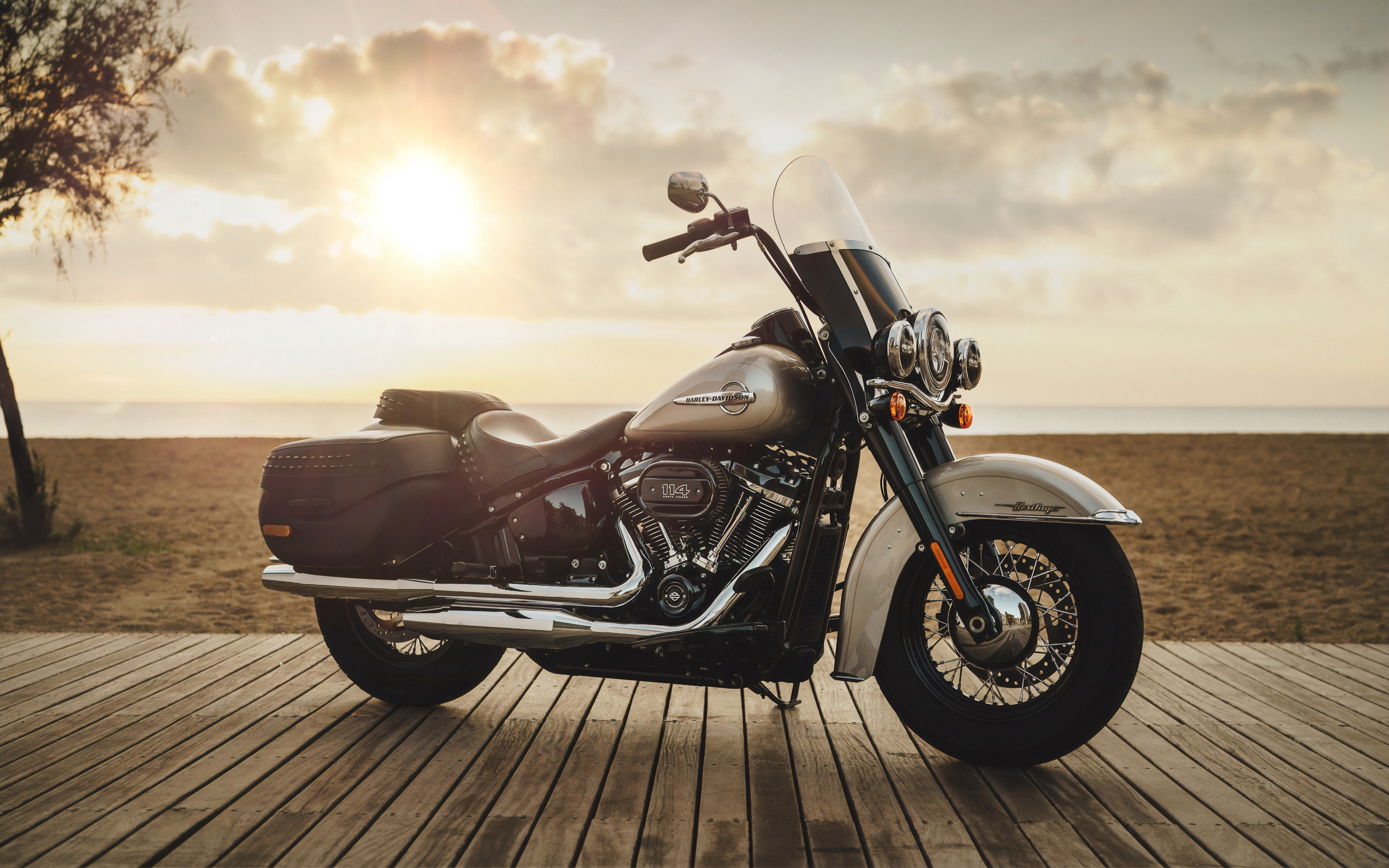 Description: A motorcycle parked on a wooden deck near the ocean at sunset or sunrise or dawn.