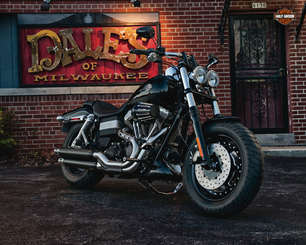 Description: A motorcycle parked in front of a building with a sign on it's side that says duke's of milwaukee.