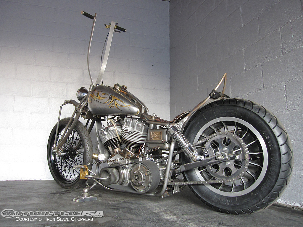 Description: A motorcycle parked in a garage next to a wall with a brick wall behind it and a white brick wall behind it.