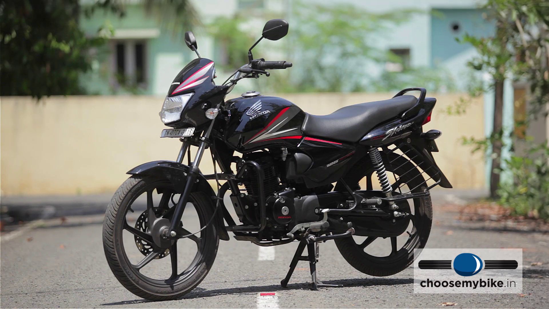 Description: A motorcycle parked on the side of the road near a building and trees in the background with a blue sky.