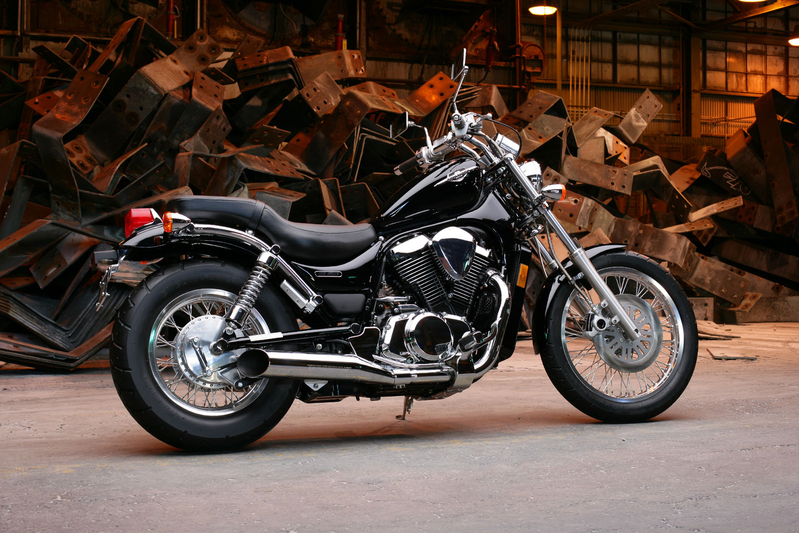 Description: A motorcycle parked in front of a pile of wood planks in a warehouse or workshop area with a large pile of wood behind it.