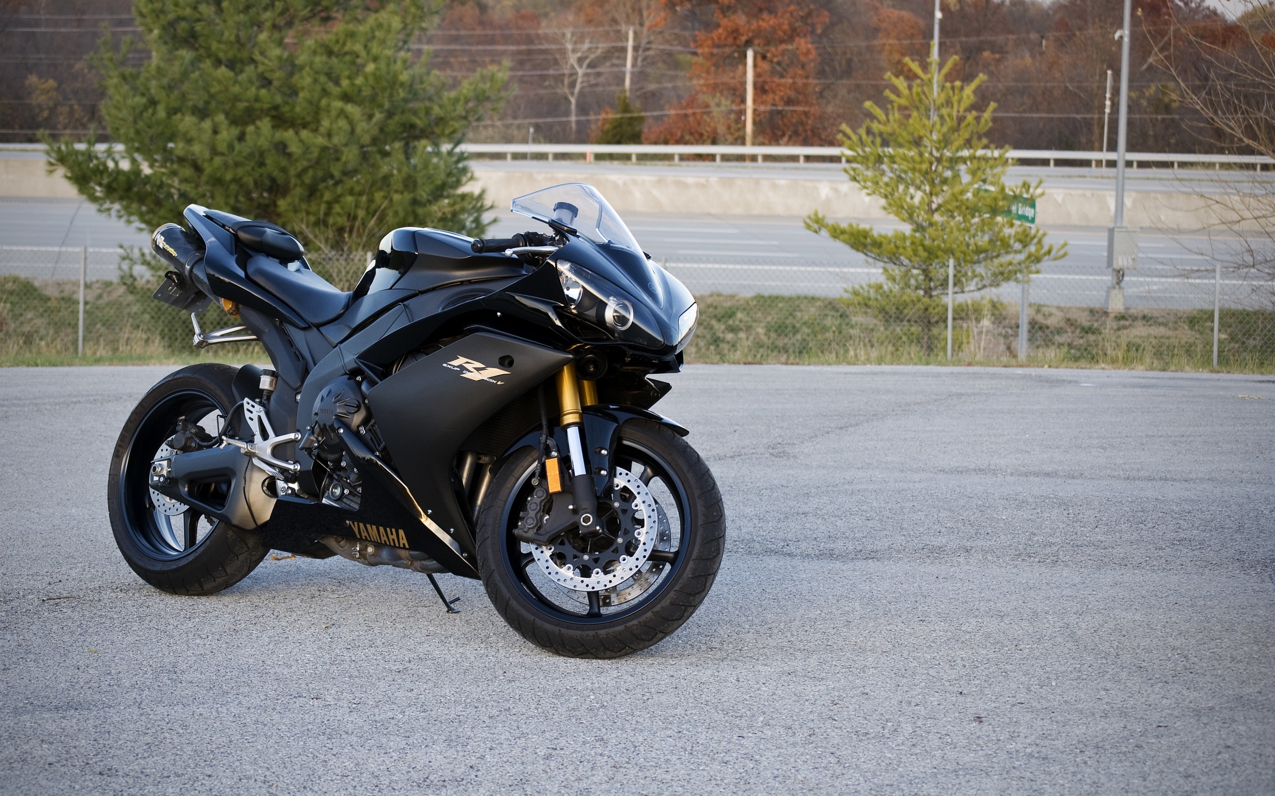 Description: A black motorcycle parked in a parking lot next to a fence and trees in the background with a fenced in area behind it.