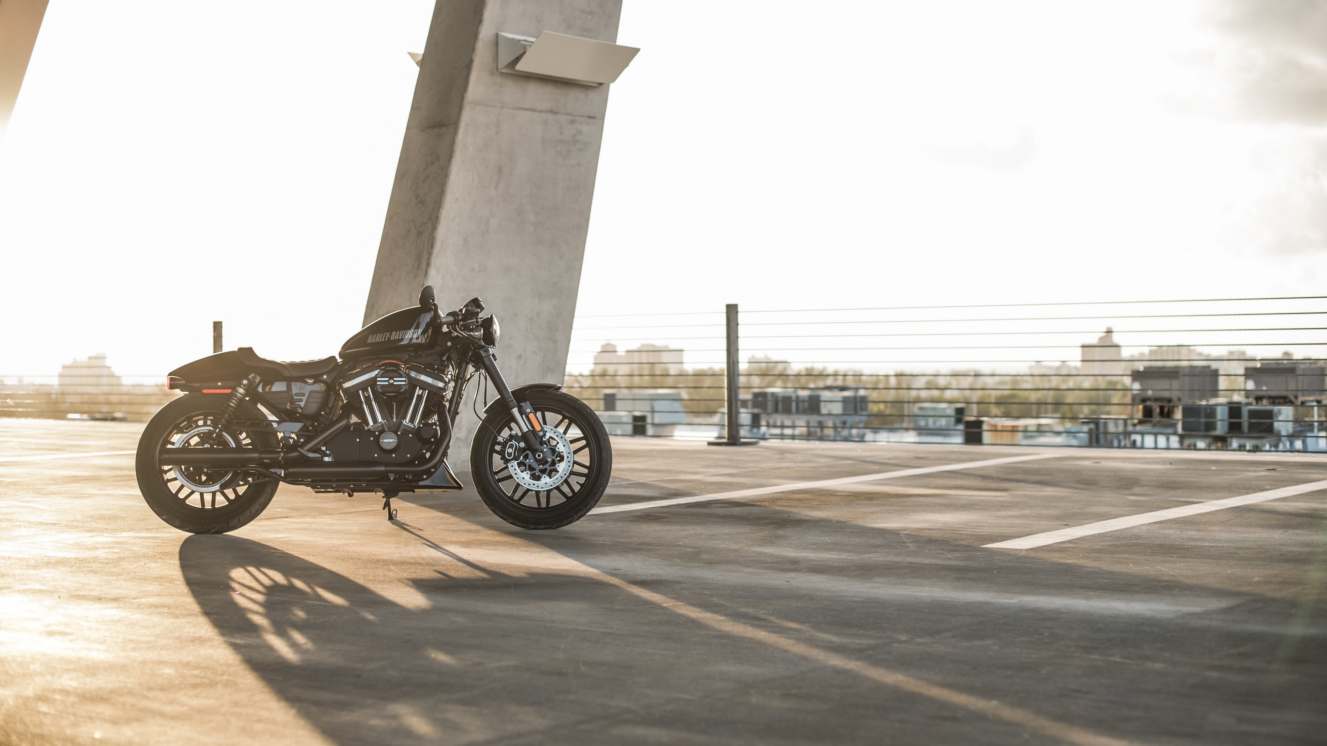 Description: A motorcycle parked in a parking lot next to a tall building with a clock on it's side.