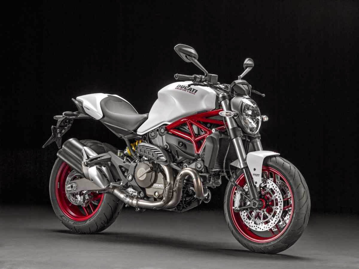 Description: A white and red motorcycle parked in a dark room with a black background and a black backdrop with a red and white stripe.