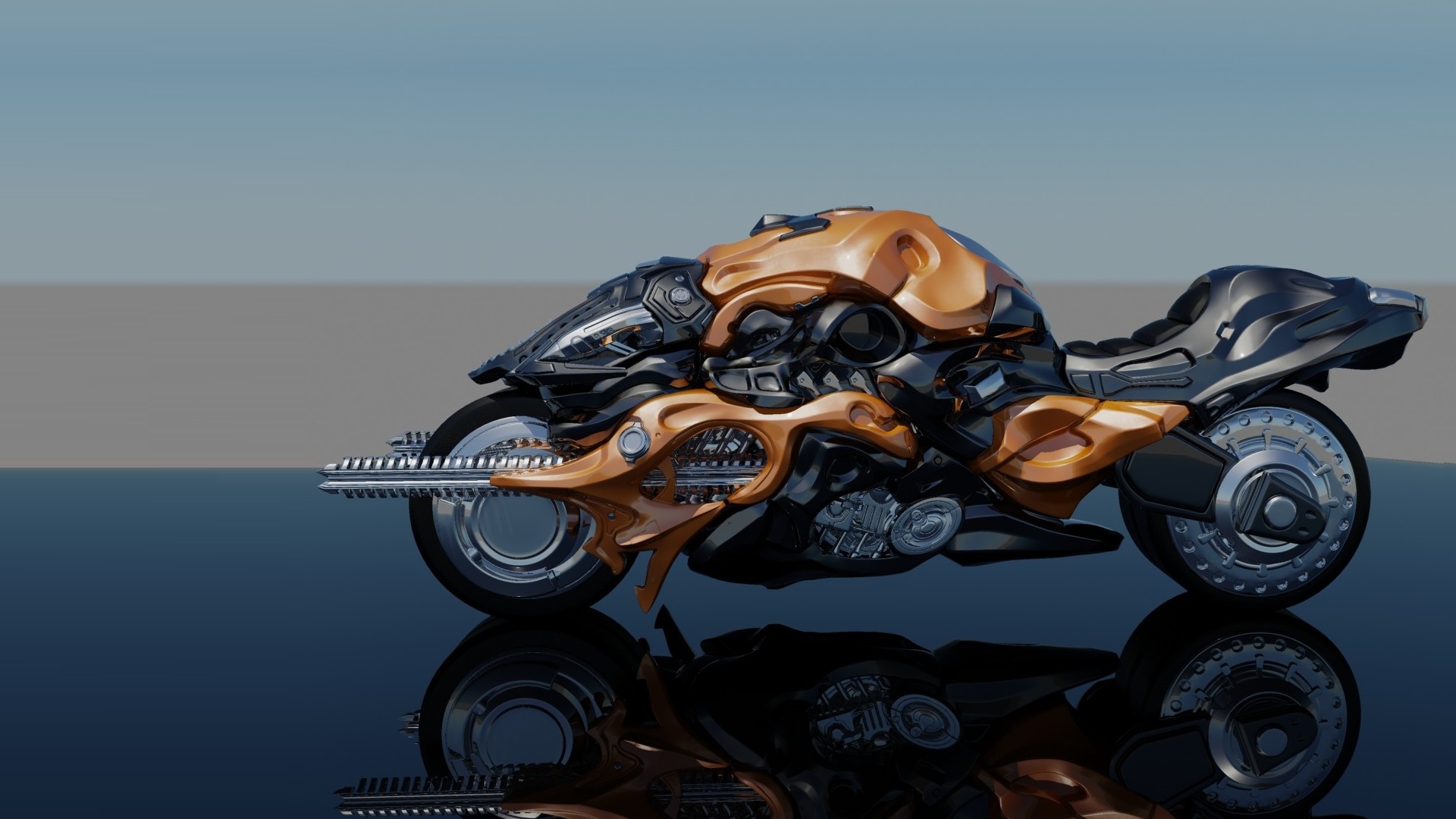 Description: A motorcycle is shown on a reflective surface with a reflection in the water below it and a blue sky behind it.