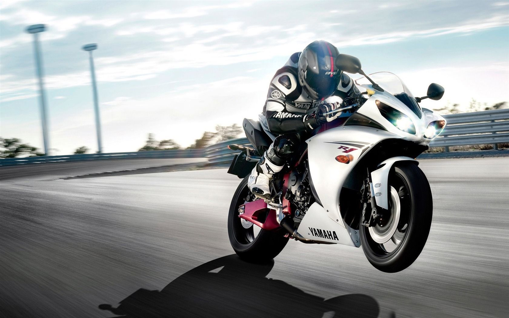 Description: A person riding a motorcycle on a road near a fence and a building with a sky background and clouds.