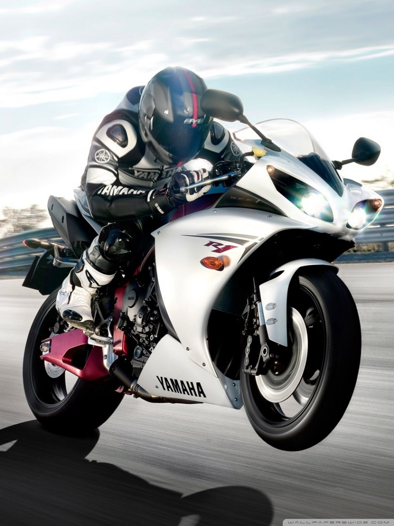 Description: A person riding a motorcycle on a road with a sky background and clouds in the background.