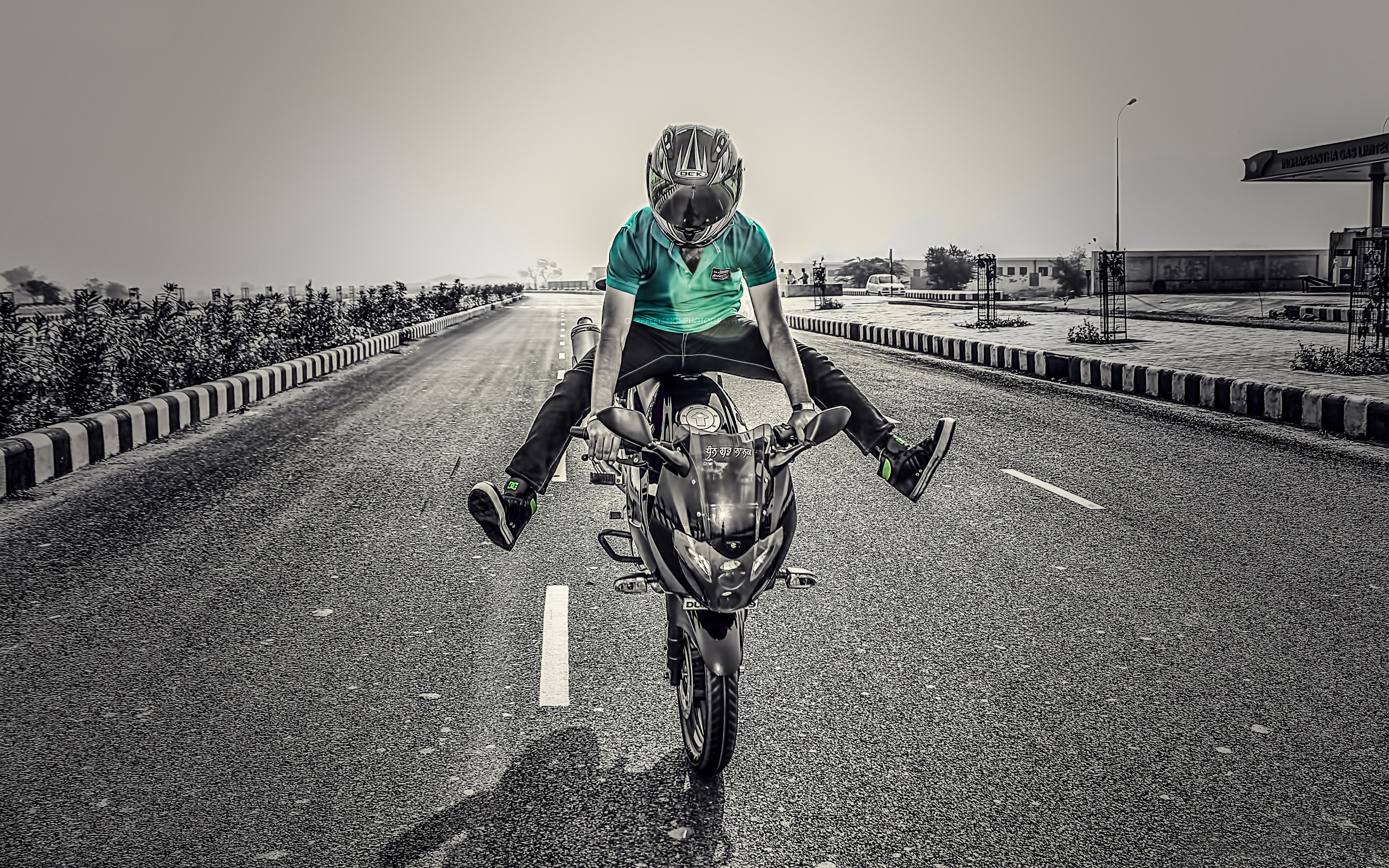 Description: A person riding a motorcycle on a road with a sky background and a line of trees in the background.