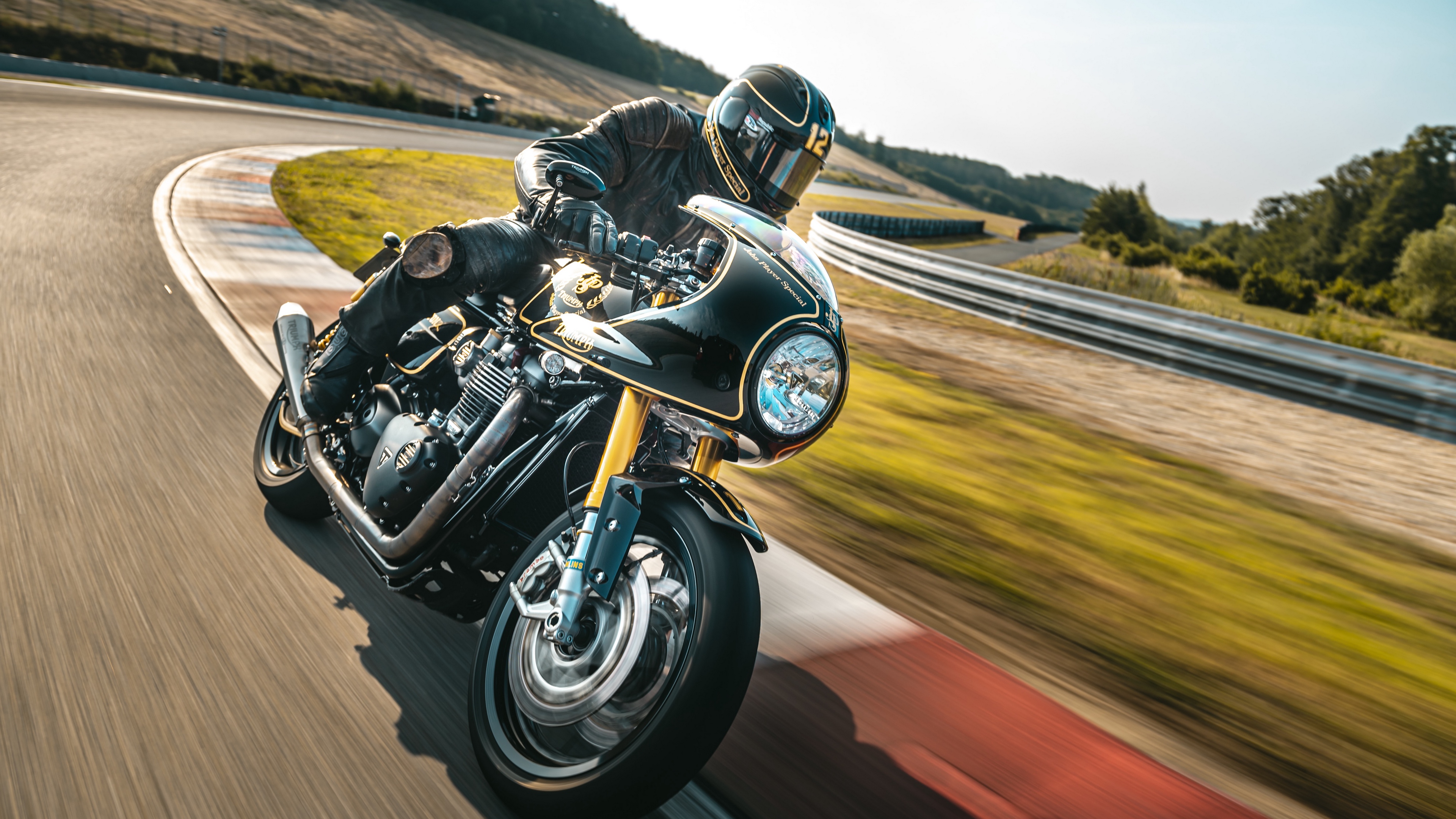Description: A man riding a motorcycle down a curvy road next to a lush green hillside on a sunny day.