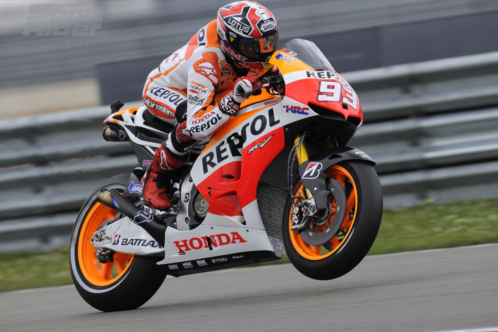 Description: A person riding a motorcycle on a track with grass in the background and a fence in the foreground.