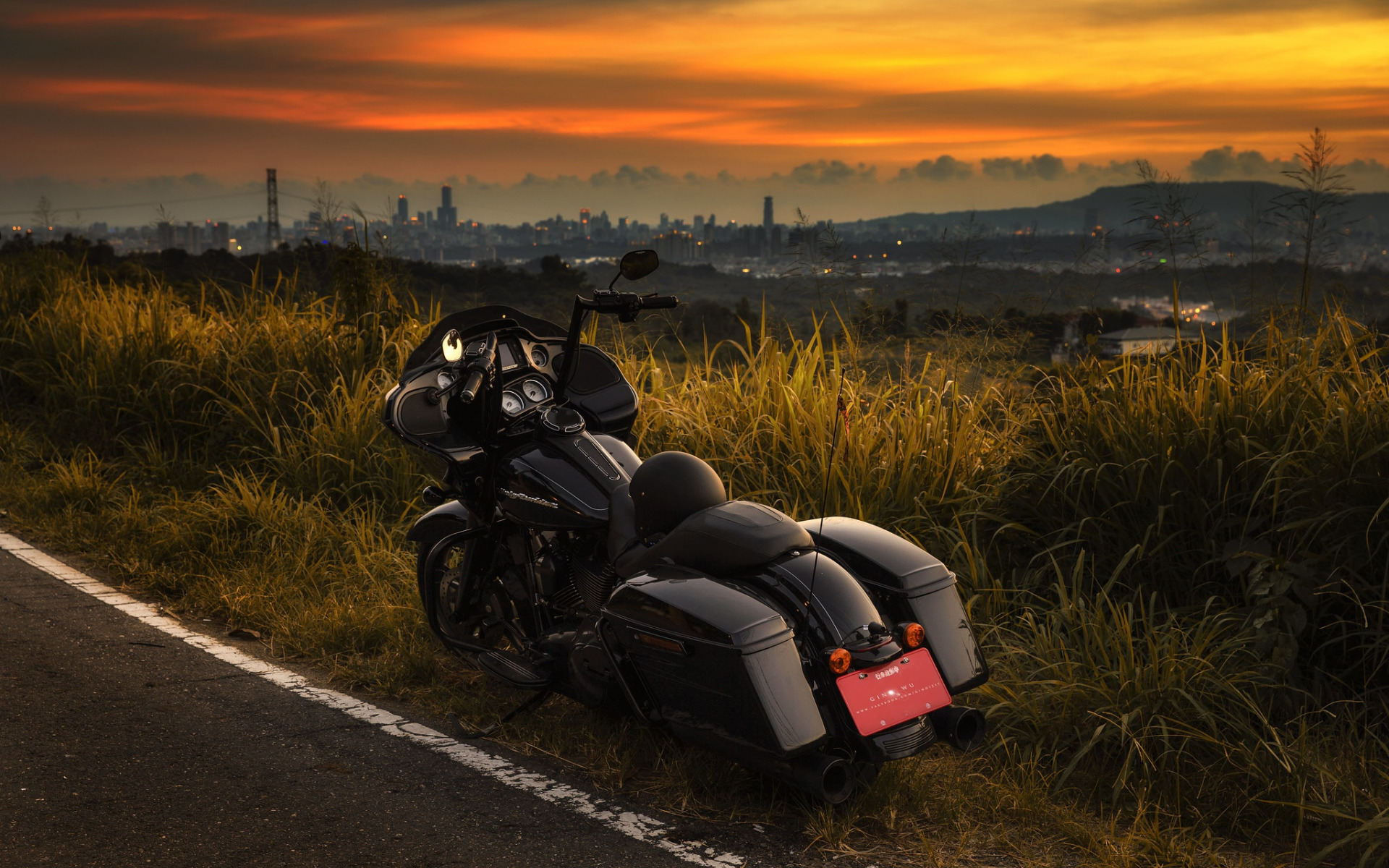 Description: A motorcycle parked on the side of a road near a field of grass and a sunset in the background.