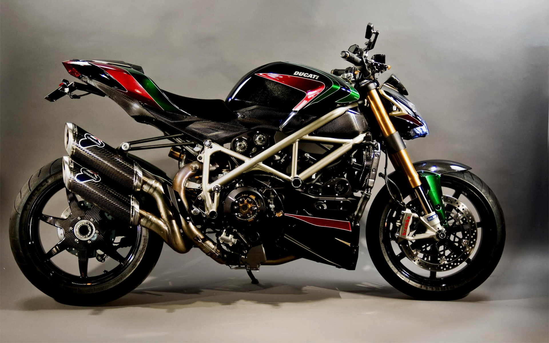 Description: A motorcycle is shown in a studio photo with a gray background and a red.