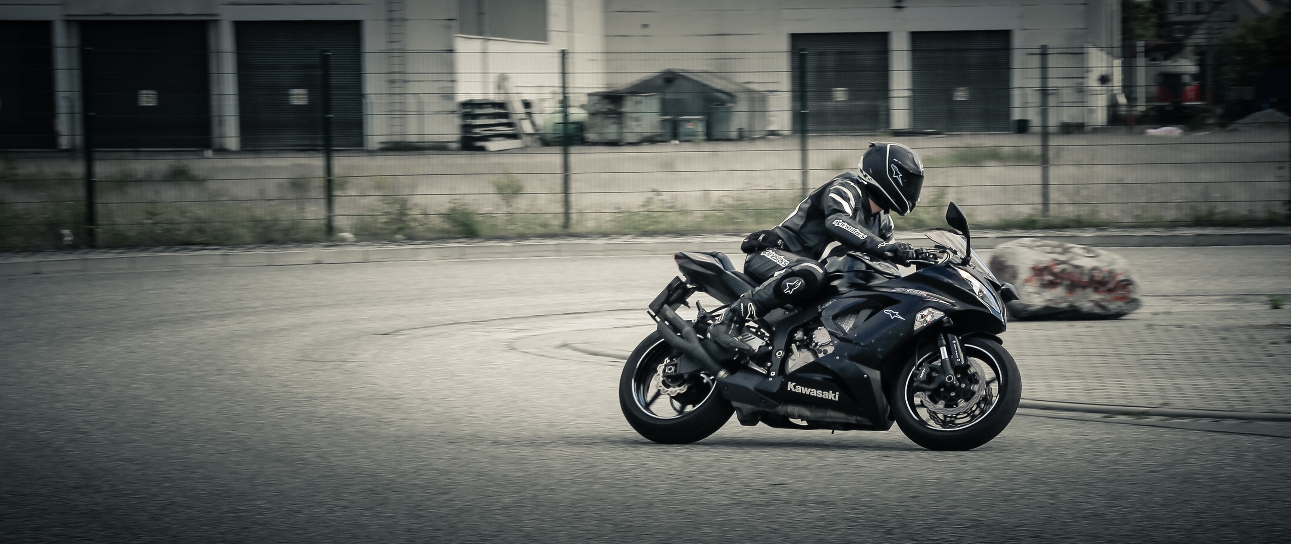 Description: A person riding a motorcycle on a city street near a fence and a building with a chain link fence.
