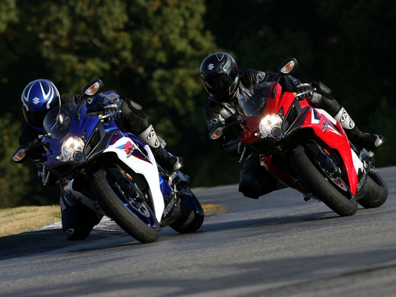 Description: Two motorcycles are racing on a track near trees and bushes.
