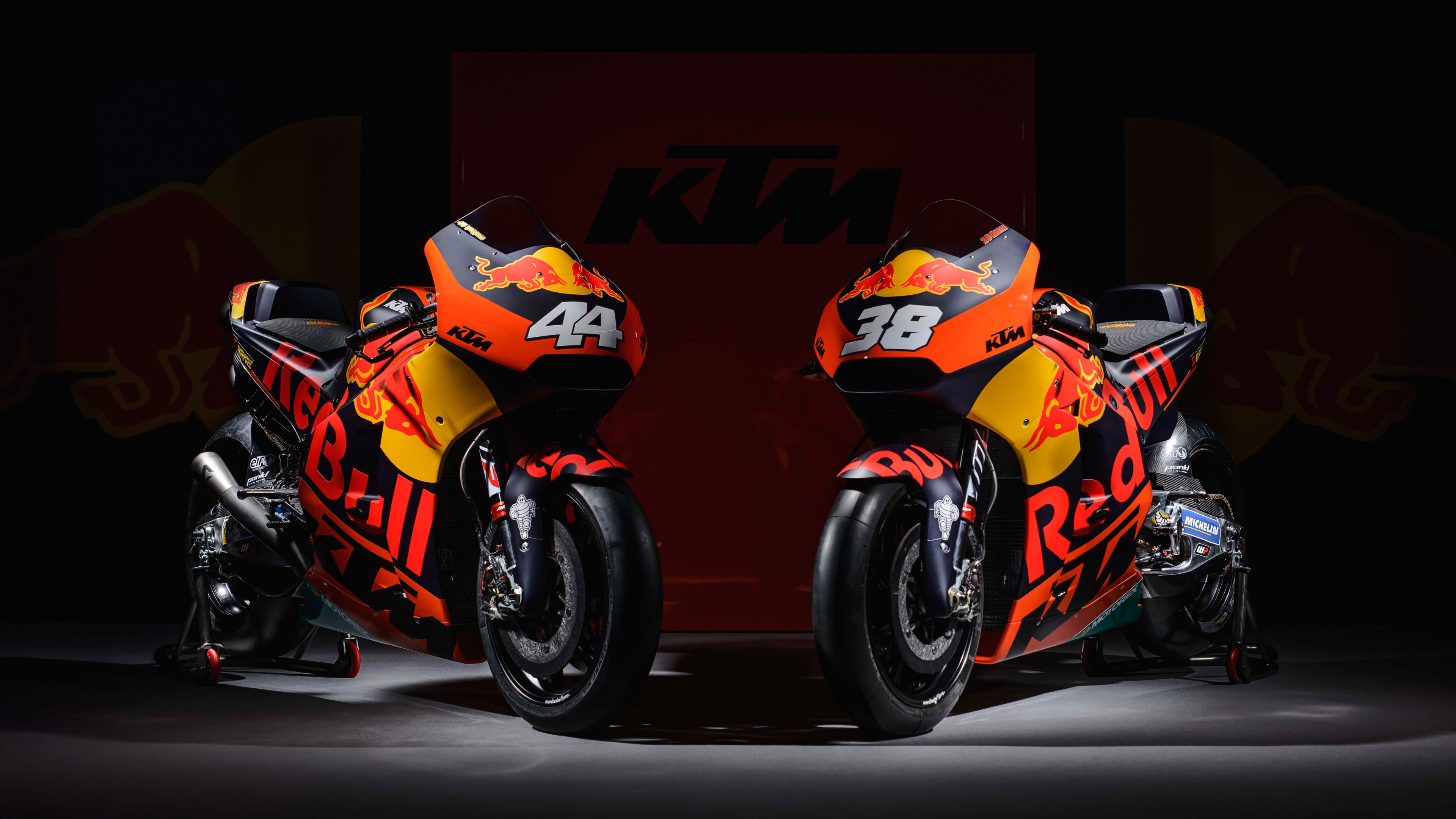 Description: Two motorcycles are shown side by side in a dark room with a red and yellow background and a black background.