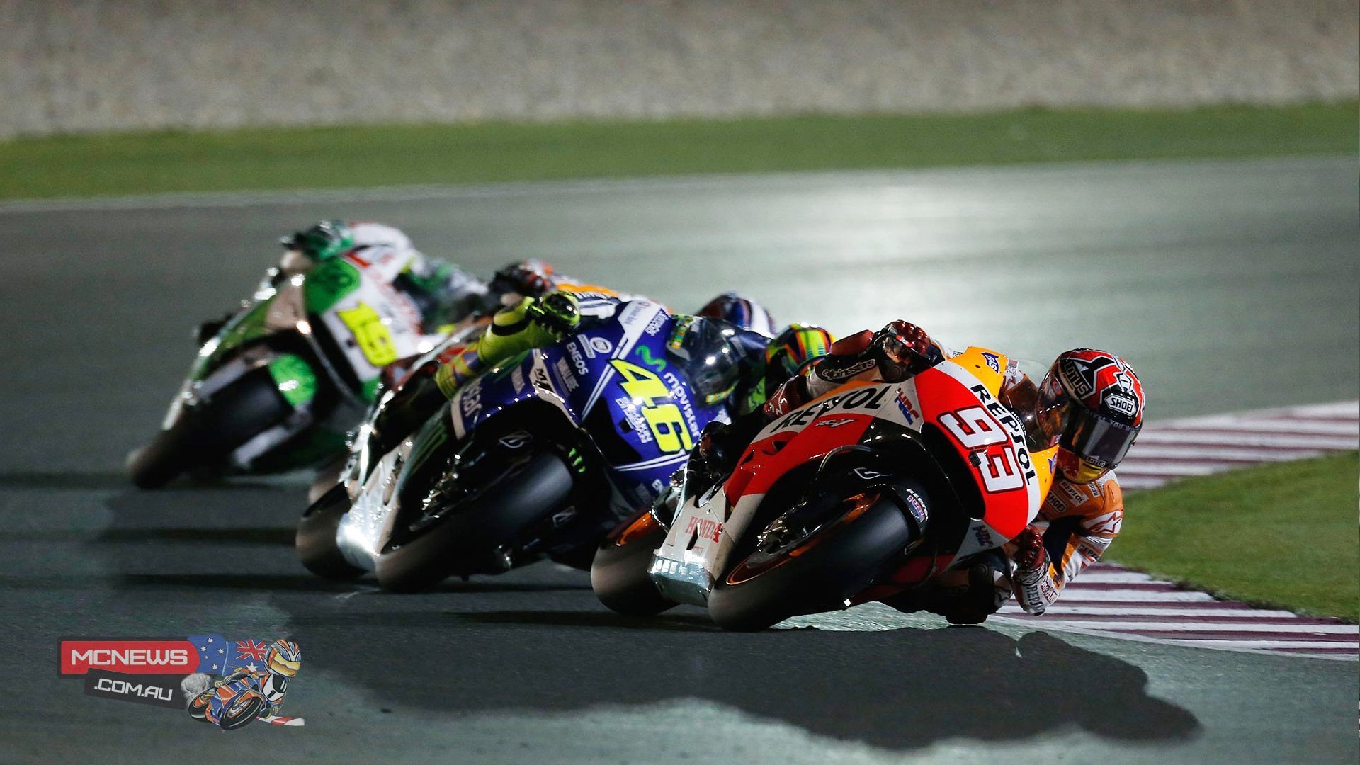 Description: A group of motorcyclists racing on a track at night time with lights on the side of the track.