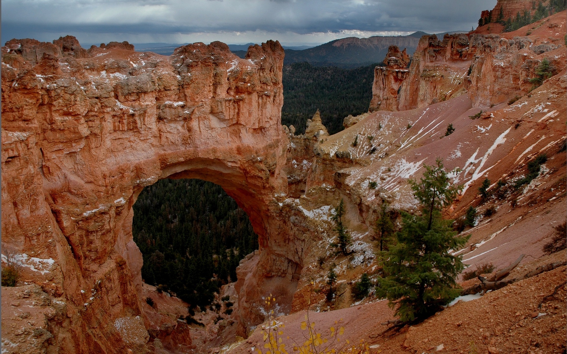 Description: A large arch in the side of a mountain with a forest below it and a cloudy sky above it.