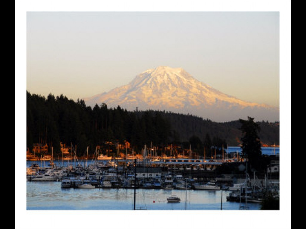 Description: A mountain is in the distance with boats in the water below it and a marina in the foreground.