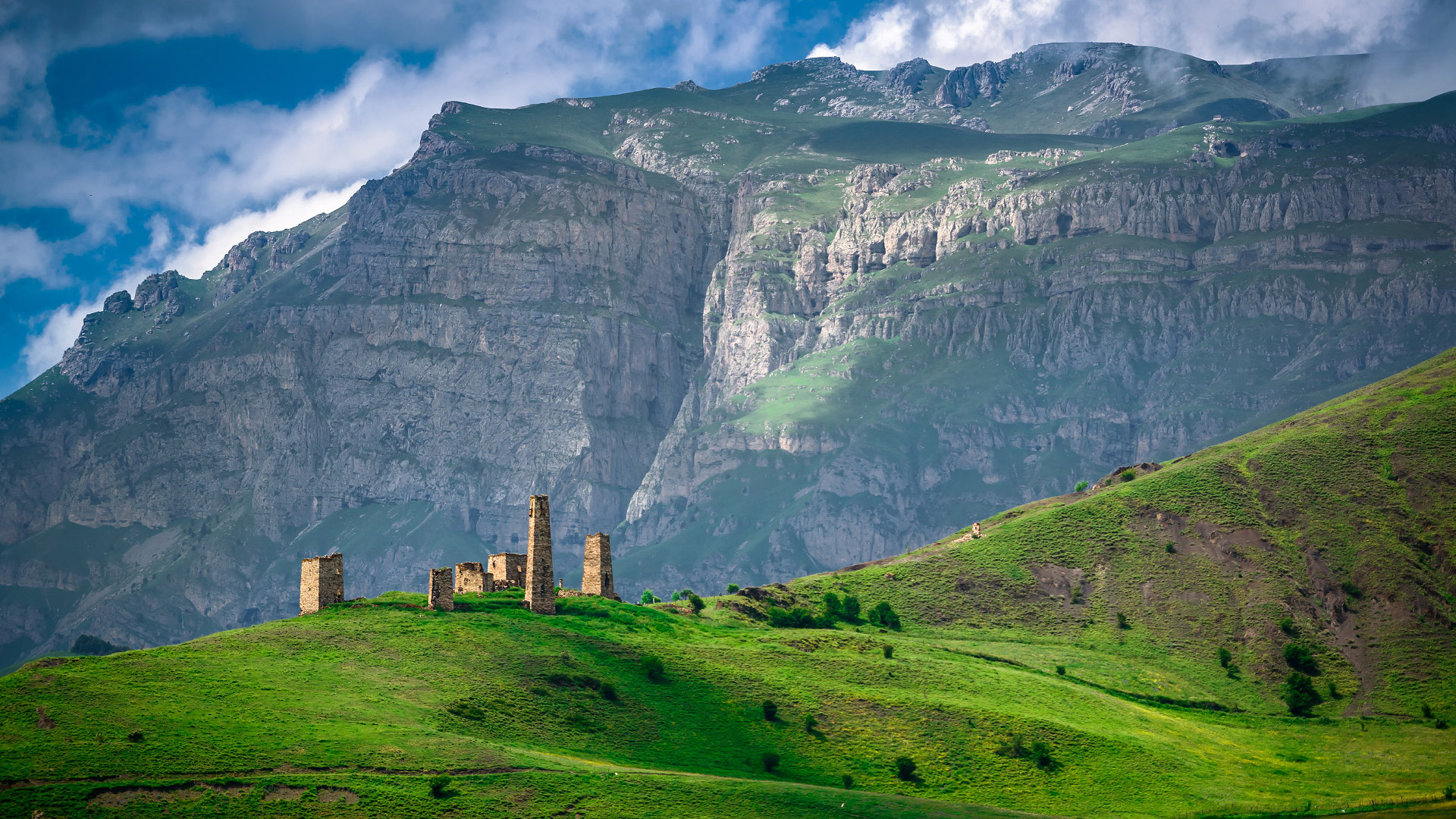 Description: A mountain with a castle on top of it and a cloudy sky above it with a mountain in the background.