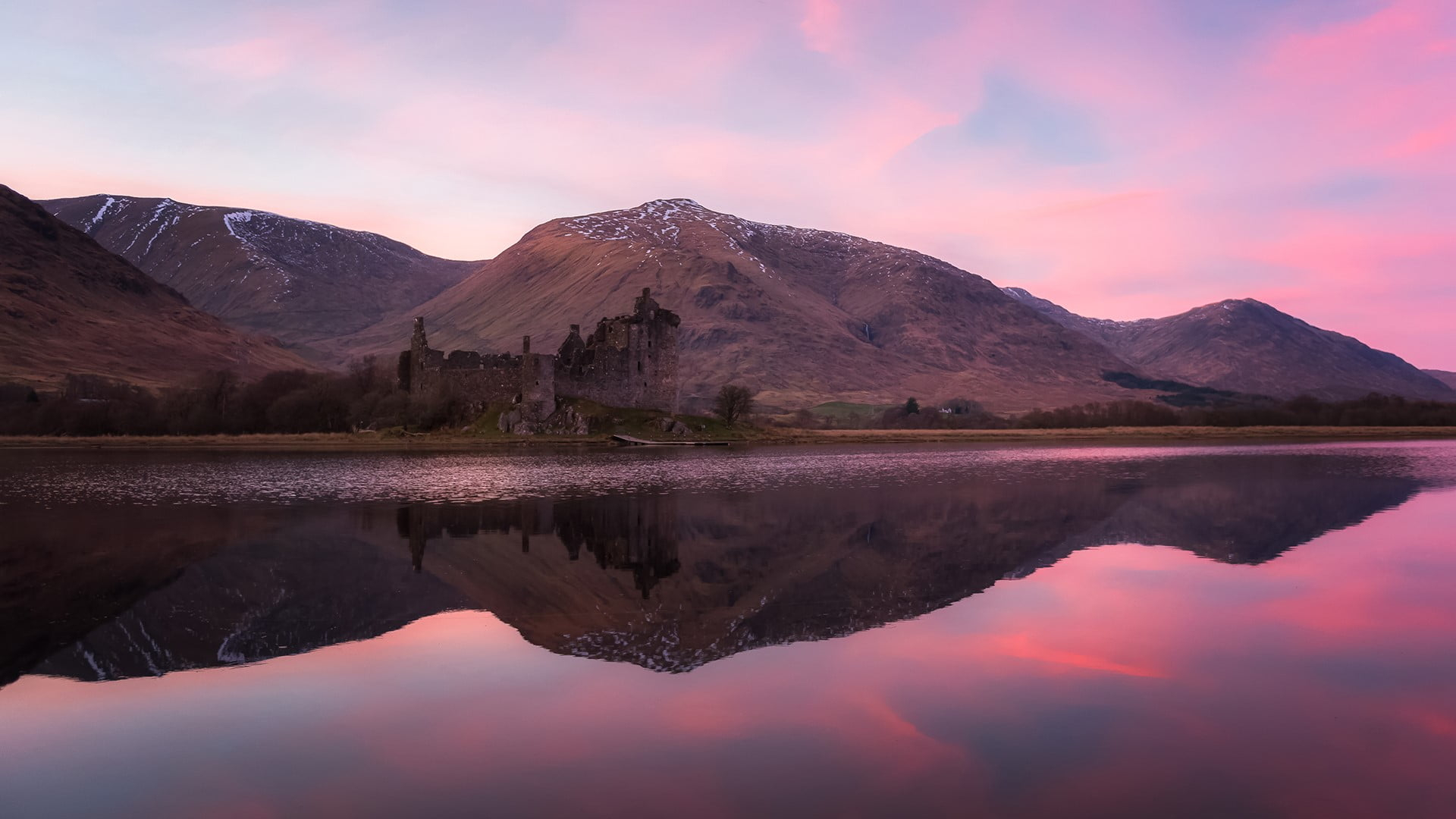 Description: A mountain range with a castle in the middle of it and a lake in front of it with a pink sky.