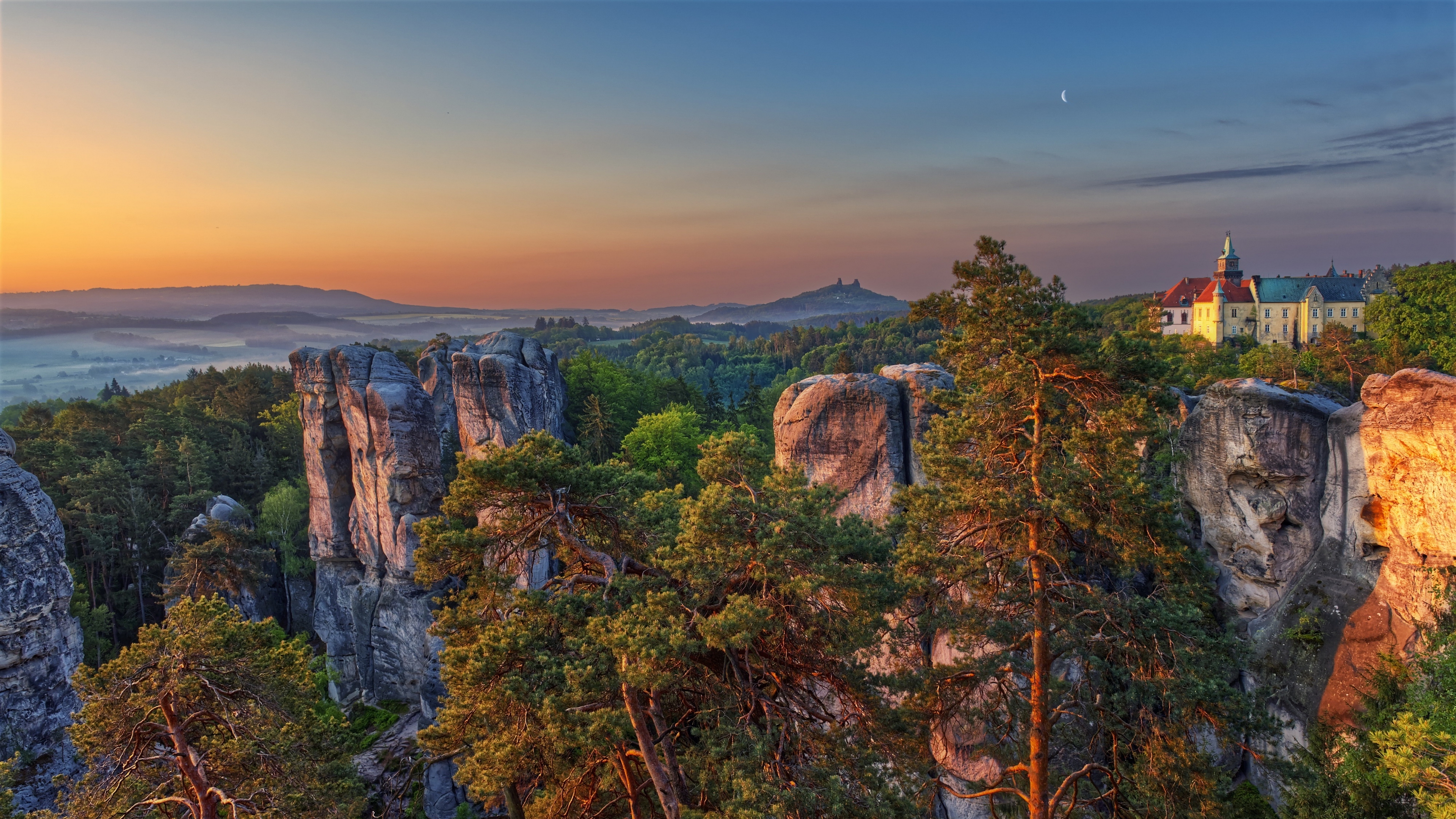 Description: A scenic view of a mountain with a church on top of it at sunset or dawn with a fog in the valley below.